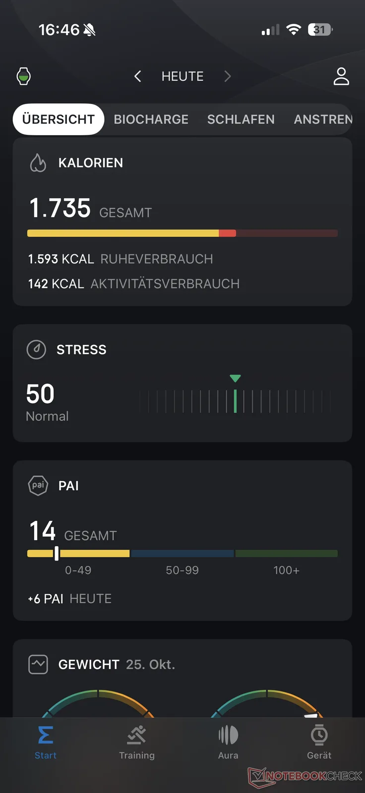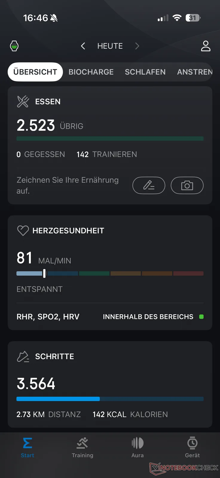 Jak zawsze, wytrzymałość zależy od różnych ustawień i intensywności użytkowania. Podczas okresu testowego zwykle aktywowaliśmy automatyczne monitorowanie tętna co 5 minut i resztę śledzenia zdrowia. Jasność wyświetlacza była automatycznie dostosowywana, a ekran wyłączał się po 8 sekundach. Przy tych ustawieniach Amazfit 3 Pro działał około dwóch tygodni na jednym ładowaniu baterii, gdy używano tylko okazjonalnego śledzenia sportu bez GPS.