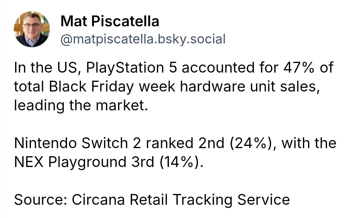 Wygląda na to, że strategia Sony polegająca na obniżeniu cen konsol PlayStation 5 zadziałała całkiem dobrze, ponieważ PS5 była podobno najlepiej sprzedającą się konsolą do gier w USA podczas Czarnego Piątku 2025. Według danych zebranych przez Circana, konsola Sony PS5 stanowiło 47% całkowitego wolumenu konsol do gier przeniesionych podczas Czarnego Piątku 2025. Nintendo Switch 2 był drugą najlepiej sprzedającą się konsolą z wynikiem 24%.