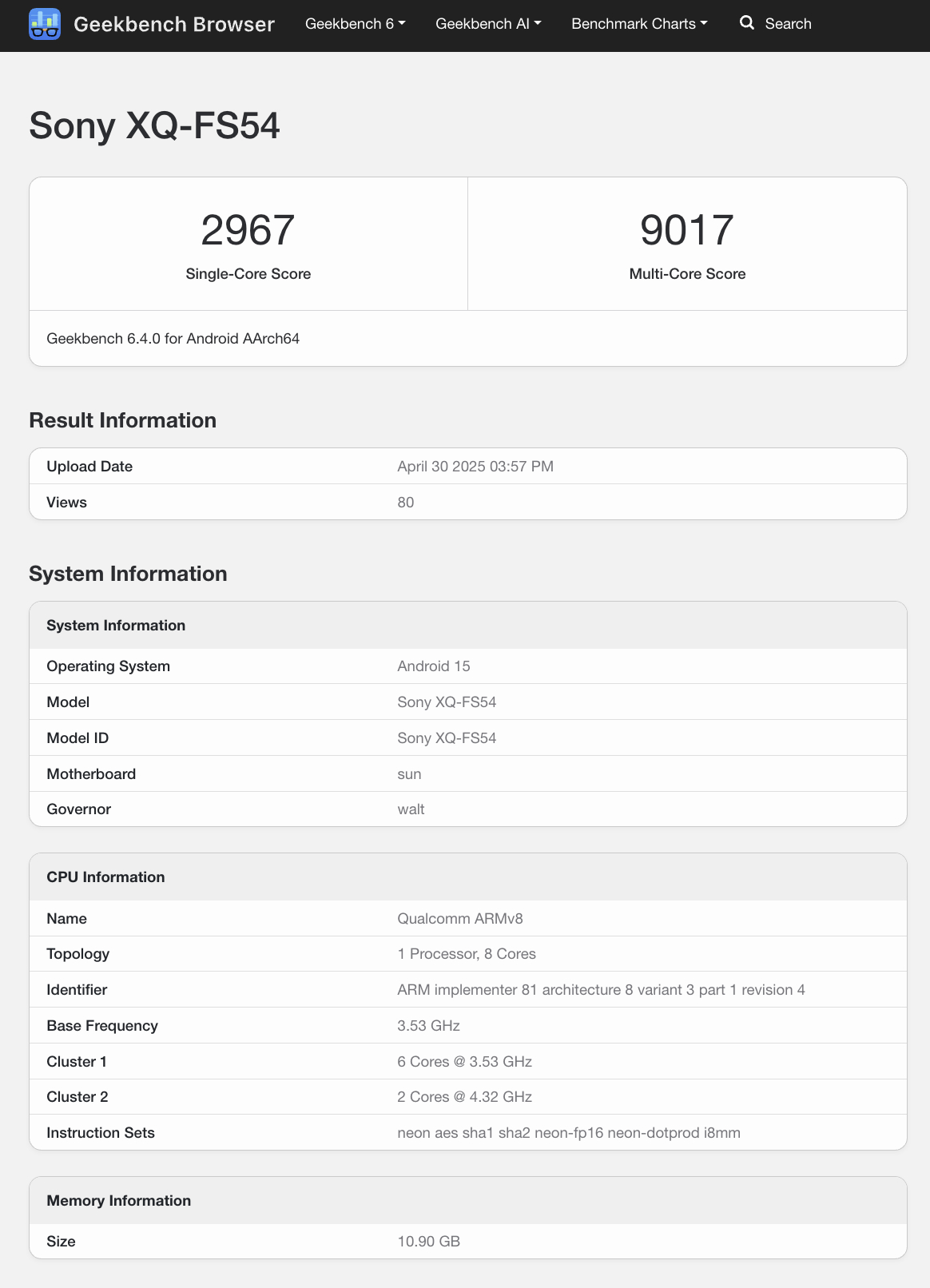 Teraz wygląda na to, że to samo urządzenie odbyło swoją pierwszą podróż przez jednordzeniowe i wielordzeniowe testy porównawcze Geekbench. Nosząc numer modelu XQ-FS54, urządzenie bez wątpienia działa pod adresem Android 15, który Sony wprowadziło do swoich smartfonów w ostatnich miesiącach. Ponadto lista benchmarków wydaje się potwierdzać włączenie Qualcomm Snapdragon 8 Elite na podstawie identyfikatora procesora i pokazanych klastrów.