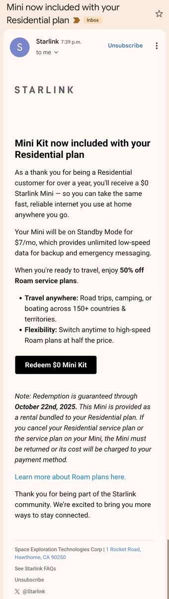 Szczęśliwi abonenci sieci Residential, którzy otrzymali wiadomość e-mail na adres https://www.reddit.com/r/Starlink/comments/1o1tztj/starlink_deal_spacex_is_offering_longtime_us_and/ będą mogli odebrać antenę Starlink Mini bez dodatkowych kosztów. Wystarczy kliknąć przycisk "Redeem $0 Mini Kit" w wiadomości e-mail, potwierdzić zamówienie, a antena zostanie dostarczona na Państwa adres. SpaceX zauważa, że link do wykupu jest ważny do 22 października. Ponadto w wiadomości e-mail wspomniano również, że użytkownicy otrzymają 50% zniżki na plany Roam, co oznacza, że będą musieli zapłacić tylko 82,5 USD za plan Roam Unlimited i 25 USD za Mini Roam. Zazwyczaj plany te kosztują odpowiednio 165 i 50 dolarów. Nie jest od razu jasne, czy obniżone ceny obowiązują tylko przez kilka pierwszych miesięcy świadczenia usługi, czy też są stałym dodatkiem dla kwalifikujących się użytkowników Residential.