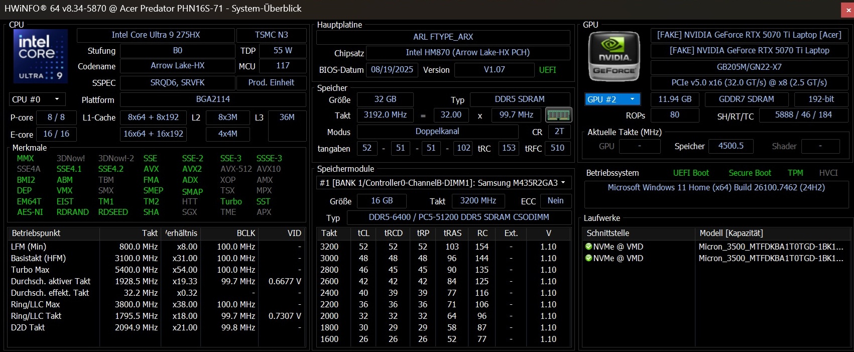 | Acer Predator Helios Neo 16S AI PHN16S-71-94L9 Ultra 9 275HX, GeForce RTX 5070 Ti Laptop | Schenker XMG FUSION 16 (M25) Ultra 9 275HX, GeForce RTX 5070 Laptop | MSI Vector 16 HX AI A2XWHG Ultra 7 255HX, GeForce RTX 5070 Ti Laptop | Lenovo Legion 5 Pro 16IAX10H Ultra 9 275HX, GeForce RTX 5070 Ti Laptop | Razer Blade 16 RTX 5080 Ryzen AI 9 365, GeForce RTX 5080 Laptop | Średnia w klasie Gaming | |