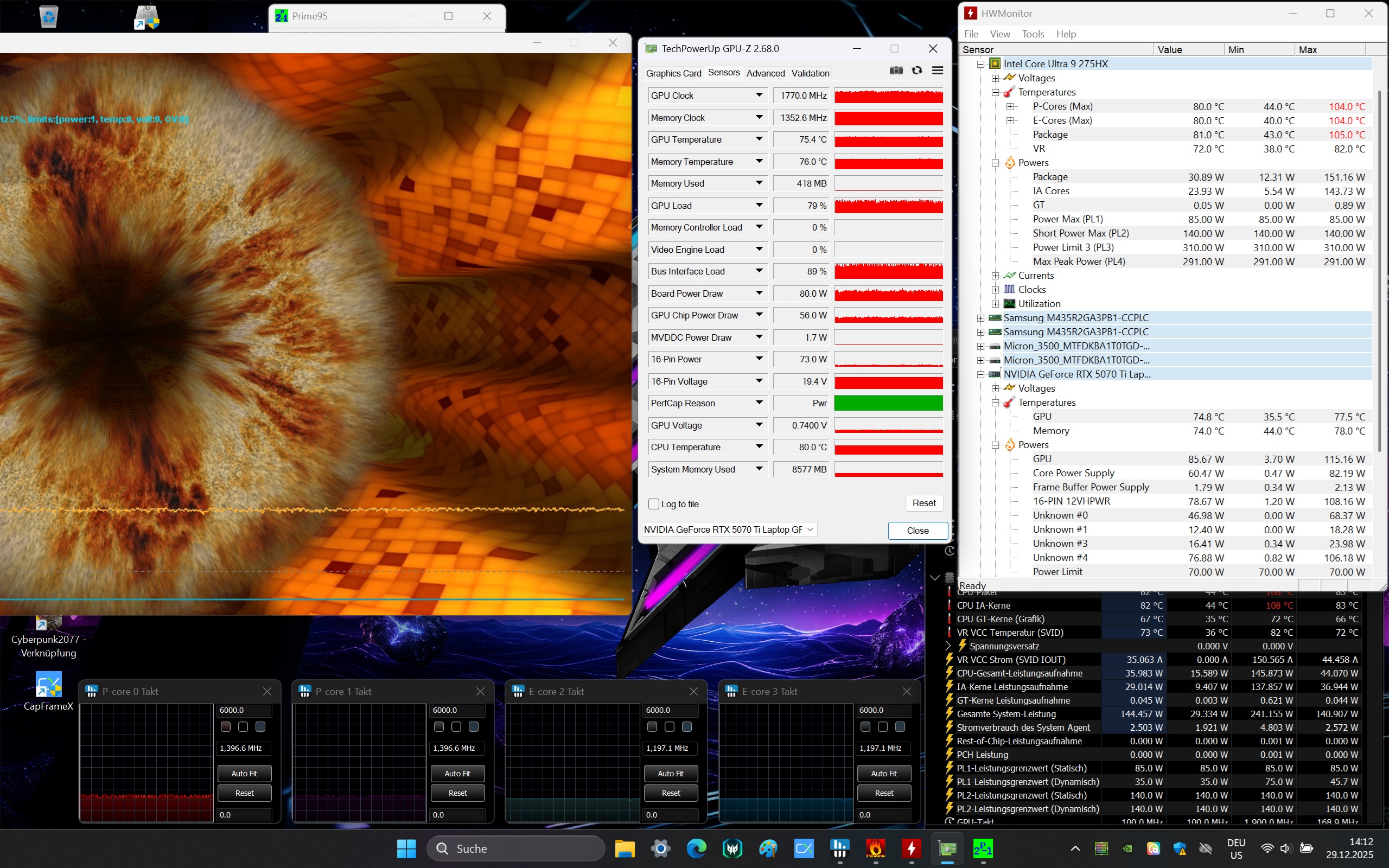 W teście obciążeniowym za pomocą narzędzi Furmark i Prime95, szczególnie procesor wycisnął z siebie sporo potu. Po chwilowym przekroczeniu 100 °C, temperatura ustabilizowała się na akceptowalnym poziomie 80 °C. W międzyczasie GPU ustabilizowało się na poziomie około 75 °C.
