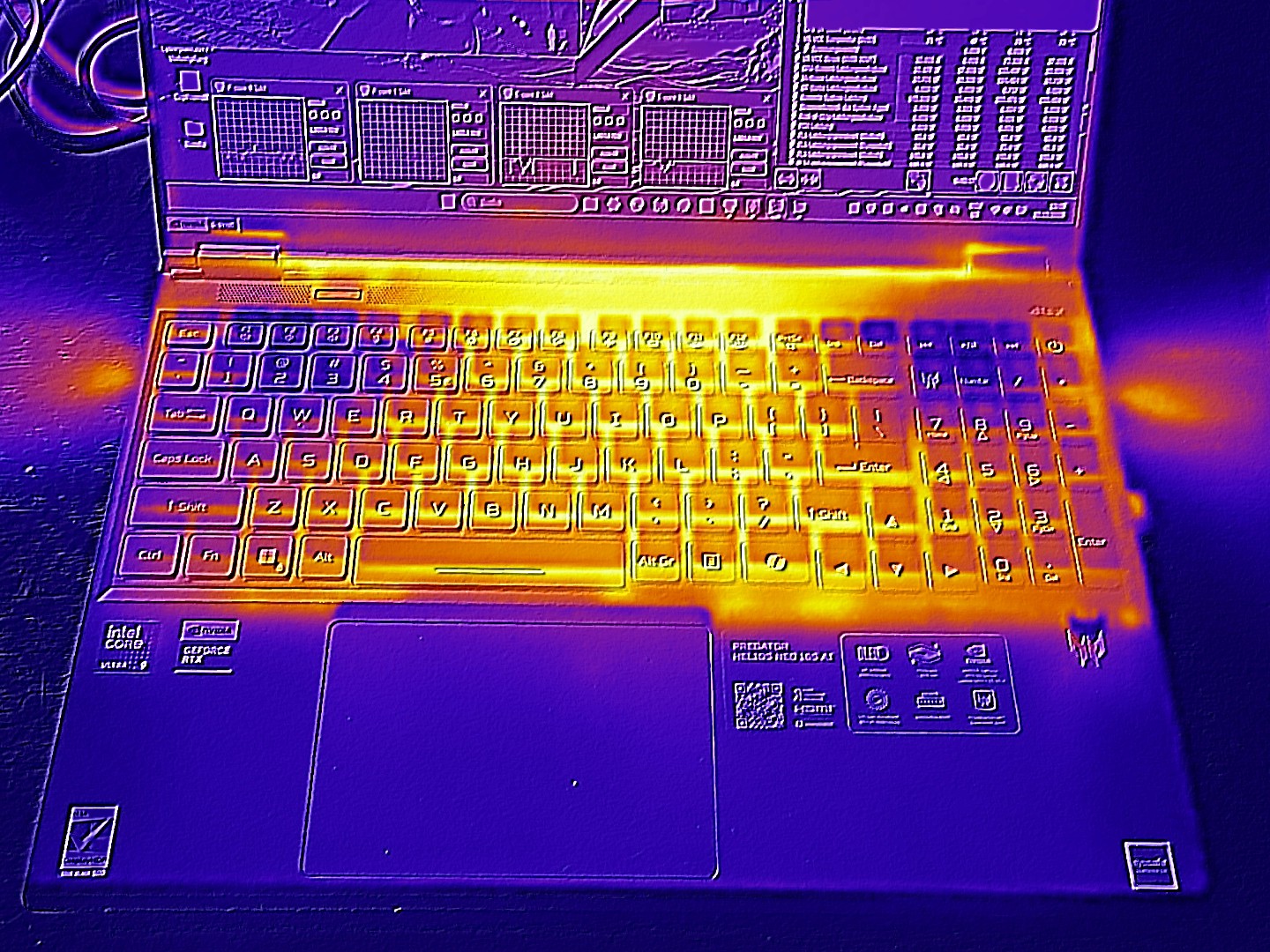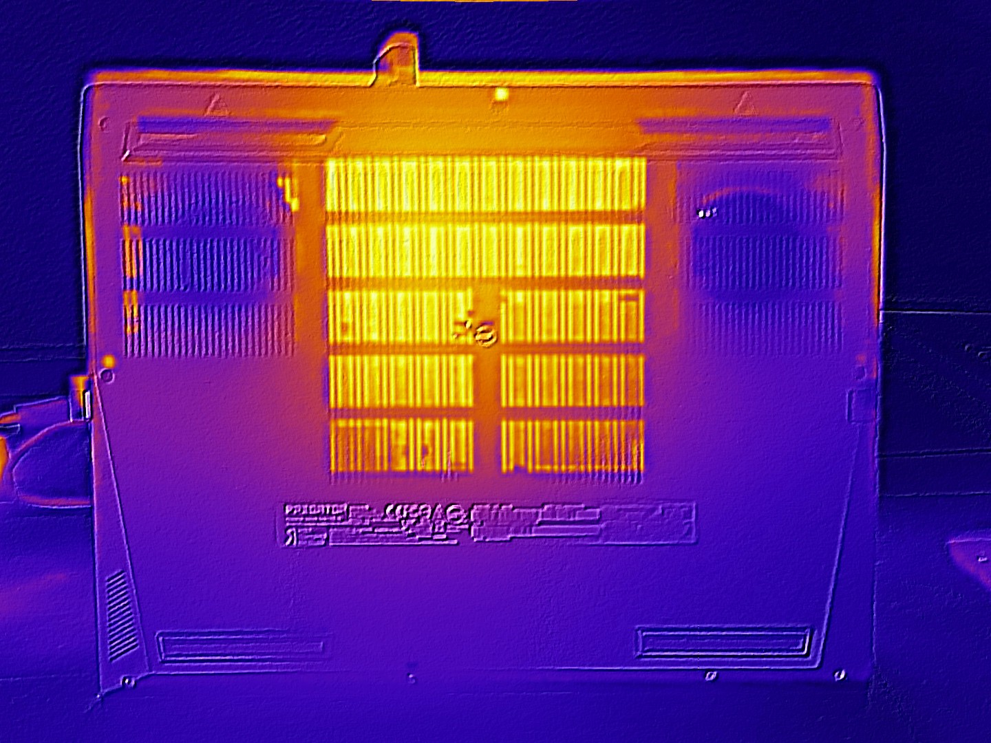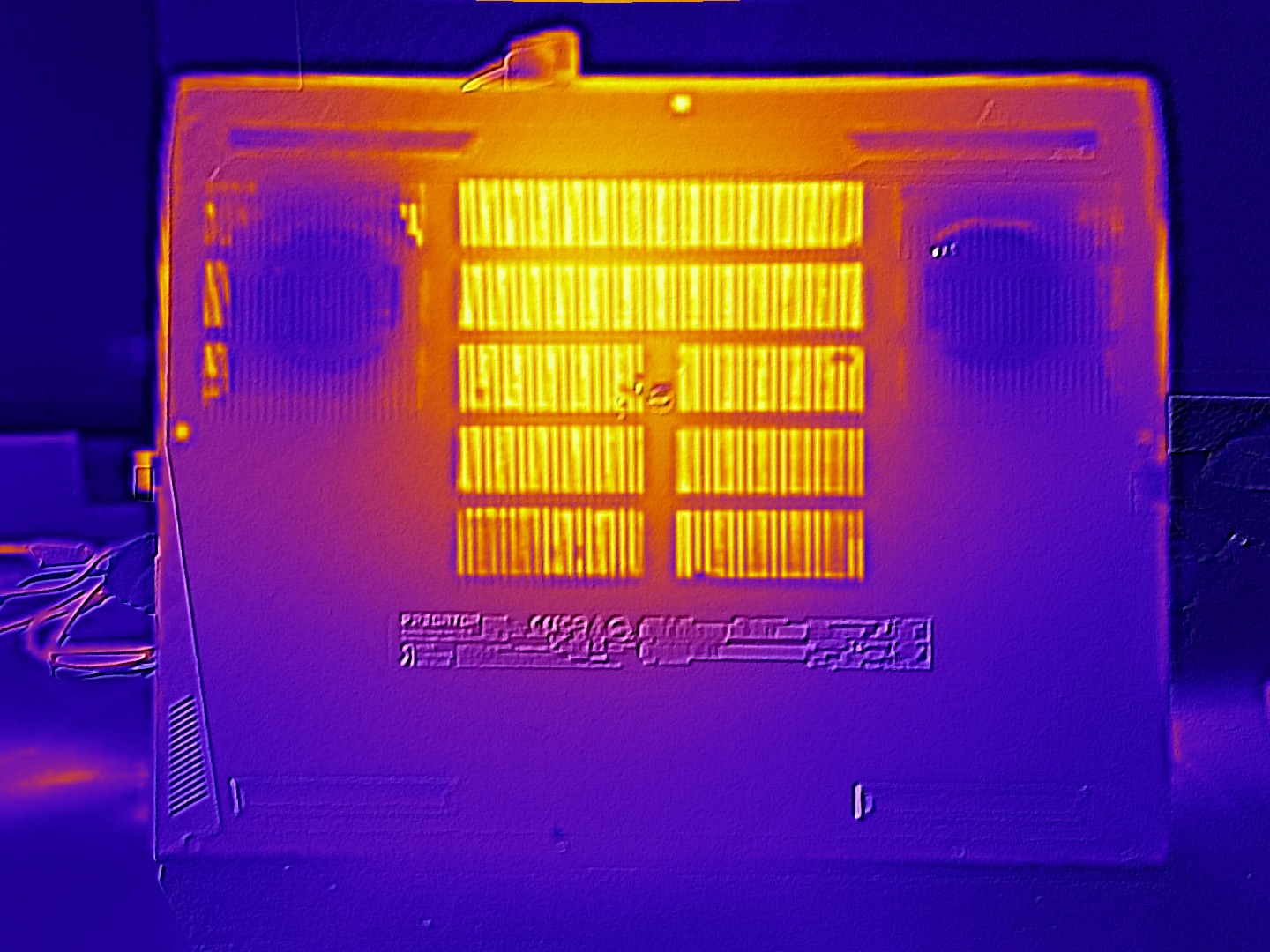 Wnioski dotyczące zmian temperatury są podobne. Dopóki notebook pracuje na biegu jałowym, powierzchnie pozostają przyjemnie chłodne i utrzymują się poniżej 30 °C. W trybie 3D, szczególnie dolna część obudowy osiąga znacznie wyższe temperatury: maksymalnie 55 °C przemawia przeciwko sesjom grania na kolanach. Temperatura na górze jest bardziej umiarkowana i wynosi maksymalnie 47 °C.