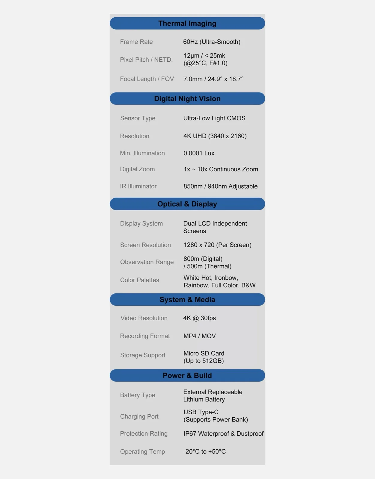 Producent reklamuje dziesięciokrotny zoom, ale ze względu na brak informacji można przypuszczać, że jest to zoom cyfrowy, który negatywnie wpływa na jakość obrazu. SpectraEyes ma również kamerę termowizyjną, która może rejestrować 60 obrazów na sekundę, chociaż rozdzielczość tej kamery nie została określona. Żywotność baterii ma wynosić od czterech do pięciu godzin w przypadku korzystania z kamery noktowizyjnej lub dwie godziny w przypadku korzystania z obu kamer. Dwa wyświetlacze, każdy o rozdzielczości 1280 x 720 pikseli, pokazują filmy z obu kamer jednocześnie