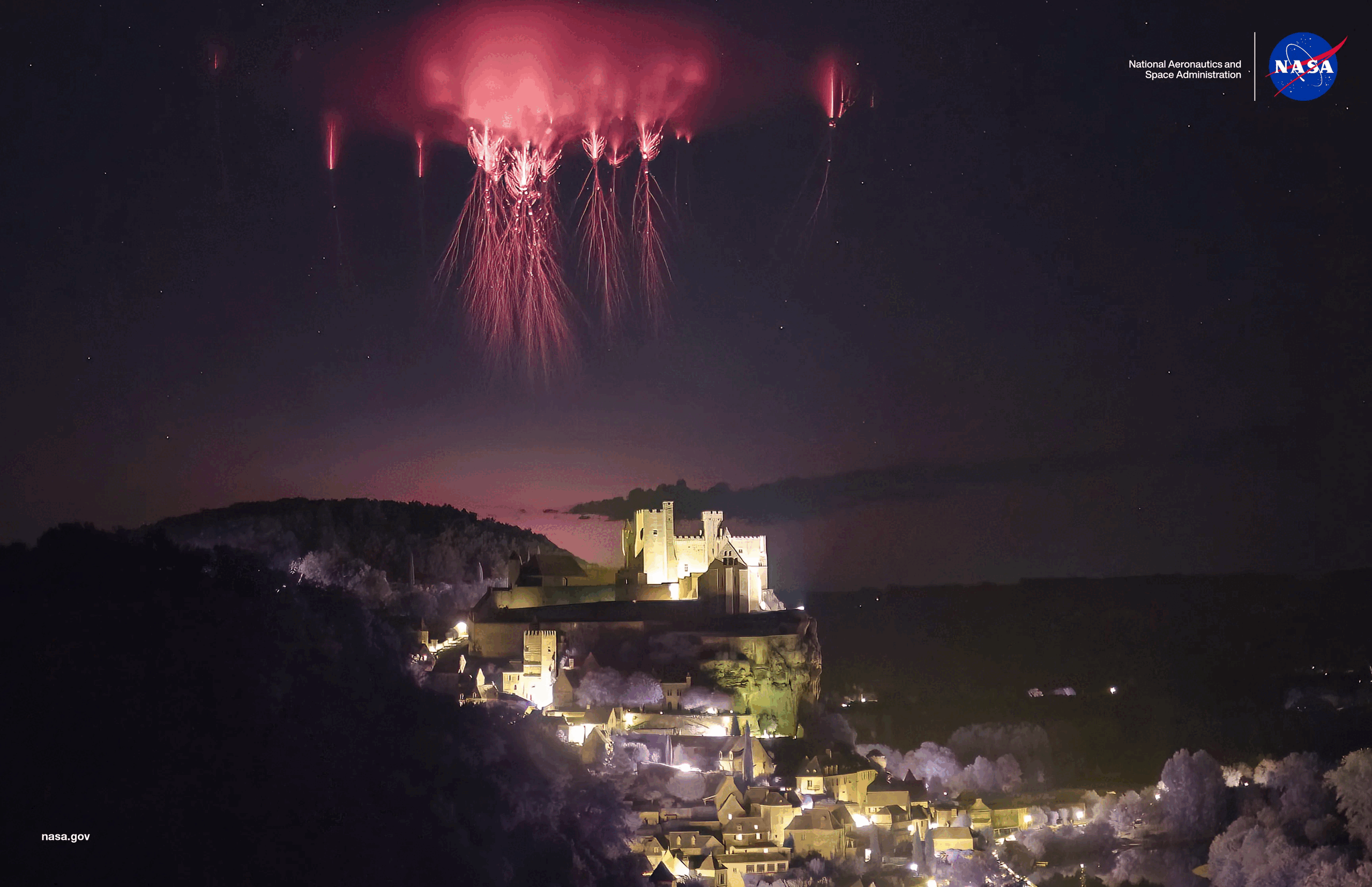 Sprite'y, takie jak ten widziany nad Château de Beynac, są najczęstszymi zjawiskami TLE. Nie są to jednak zjawiska, z którymi można się zetknąć każdego dnia ze względu na to, jak wysoko w atmosferze występują i jak krótkotrwałe są. Występują na wysokości około 80 kilometrów nad powierzchnią Ziemi i trwają zaledwie kilka milisekund.