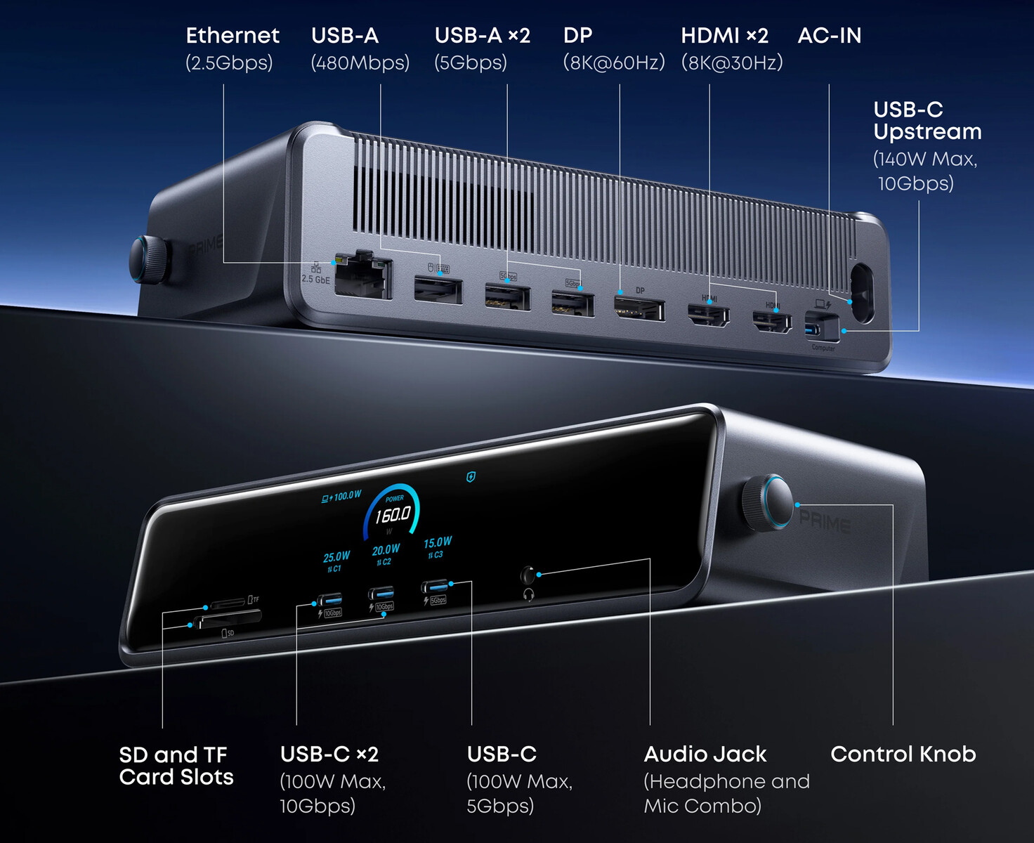 Dostępne jest wsparcie dla aplikacji https://www.anker.com/blogs/hubs-and-docks/a83b3umożliwiając użytkownikom monitorowanie wszystkich podłączonych urządzeń, zmianę ustawień wyświetlania i diagnostykę. Prime Docking Station 14-in-1 posiada również wbudowany inteligentny wyświetlacz, który pokazuje informacje o portach w czasie rzeczywistym.