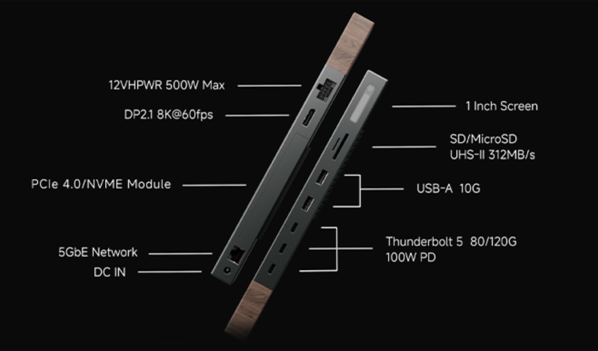 Podłączone laptopy mogą ładować się z mocą do 100 W, podczas gdy 1-calowy wyświetlacz pokazuje aktualny stan stacji dokującej. Najbardziej niezwykłą cechą jest prawdopodobnie ukryte gniazdo PCIe pod pokrywą na górze, które pozwala użytkownikowi podłączyć zwykły stacjonarny procesor graficzny w połączeniu z 500-watowym zasilaczem. Karta graficzna łączy się przez PCIe 4.0 x4.