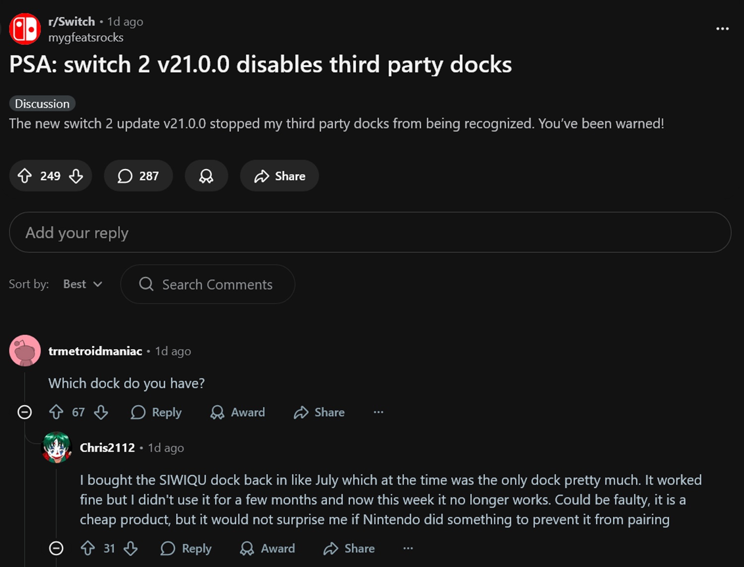 W jednym z przykładów opublikowanych na Reddit, problem dotyczył popularnej stacji dokującej Switch 2 od Siwiqu. Chris2112 wyjaśnia, że zakupił stację dokującą w lipcu i nie miał żadnych problemów. Niestety, kilka miesięcy później już tak nie jest. Gracz podejrzewa, że winna jest najnowsza aktualizacja oprogramowania układowego Nintendo, co potwierdza kilku innych czytelników.