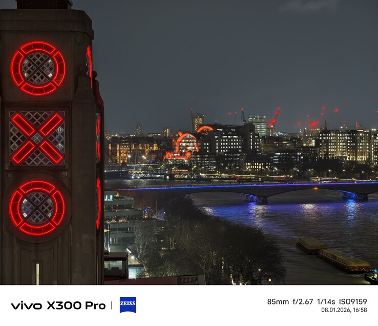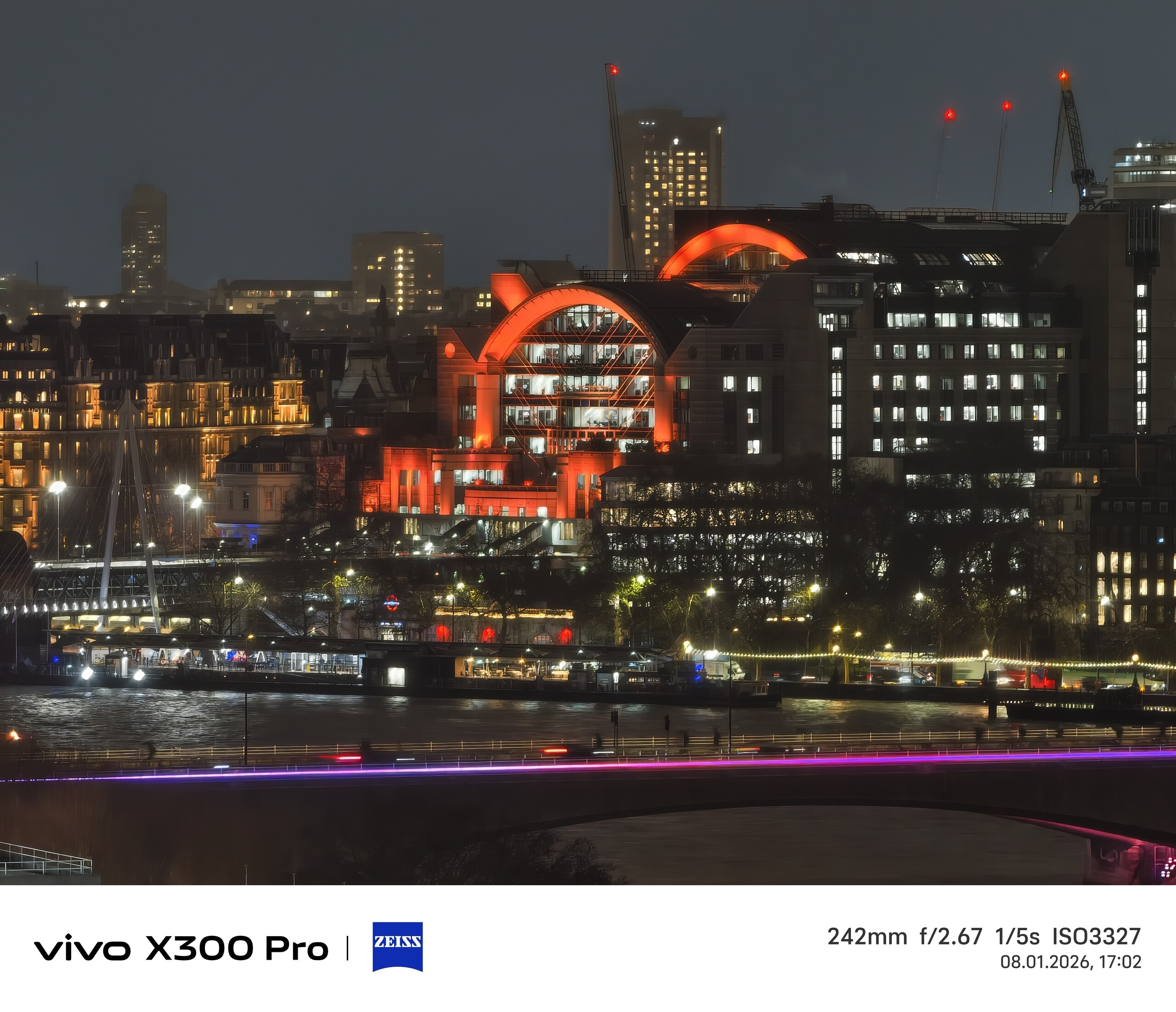 W nocy Vivo X300 Pro korzysta z bardziej czułego na światło sprzętu i zapewnia lepszą jakość obrazu, co jest szczególnie widoczne w drobnych szczegółach, takich jak drzewa na brzegu (1. zdjęcie) lub poręcz mostu (2. zdjęcie).