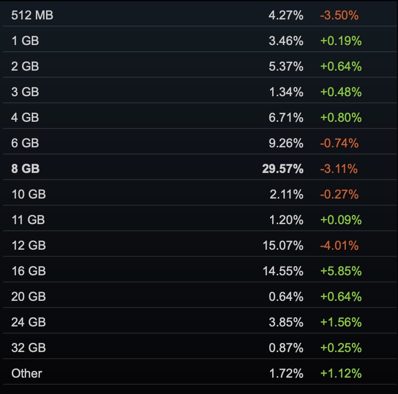 W niedawnej aktualizacji beta dla klienta Steam https://store.steampowered.com/news/group/4397053/view/512983651355462232?l=englishvalve stwierdziło, że rozwiązano pewne problemy, które wpłynęły na raportowanie pamięci VRAM, co wskazuje, że wcześniejsze ankiety mogły cierpieć z powodu błędnie raportowanych danych. Co więcej, w przypadku systemów z wieloma procesorami graficznymi, Steam będzie teraz raportował tylko GPU z największą ilością pamięci VRAM.