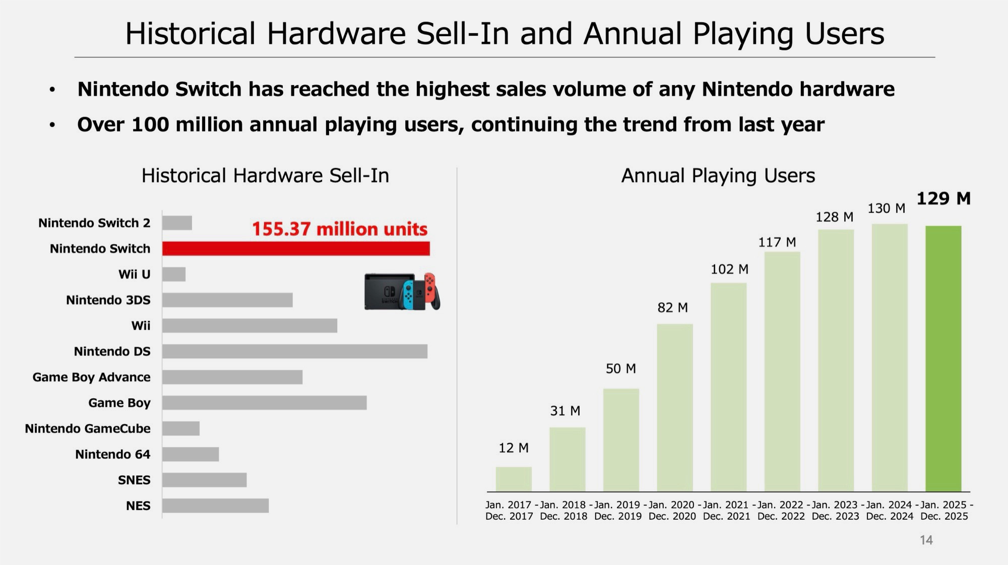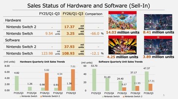 Pomimo bycia konsolą ostatniej generacji, oryginalny Switch wciąż zdołał sprzedać 3,25 miliona sztuk - spadek o 66% w porównaniu z tym samym okresem ubiegłego roku. Nintendo sprzedało łącznie 146,9 miliona gier, z czego 37,93 miliona zostało specjalnie zoptymalizowanych dla Switch 2.
