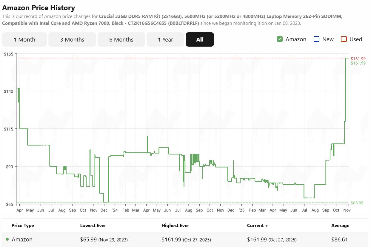 Na przykład, najlepiej sprzedający się zestaw pamięci na Amazon, 32 GB DDR5-5600 od Crucial, jest obecnie sprzedawany za 161,99 USD, co stanowi 2,75-krotny wzrost w porównaniu do 65,99 USD najniższej ceny z listopada 2023 r. (za pośrednictwem camelcamelcamelcamel).