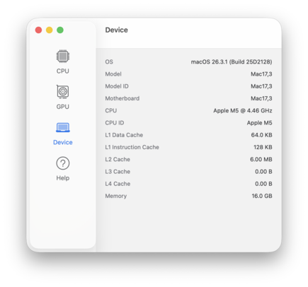 Wydajność procesora nowego Apple M5 (4 super rdzenie, 6 rdzeni wydajnościowych) jest bardzo imponująca i jest to najszybszy jednordzeniowy procesor, jaki można kupić z dość dużym marginesem. Wydajność wielordzeniowa jest również bardzo dobra, chociaż system musi dość szybko zmniejszyć limit mocy. Deficyt w porównaniu do MacBooka Pro 14 M5 z aktywnym chłodzeniem nadal wynosi tylko 18% podczas testu Cinebench 2024 Multi, który trwa kilka minut i gdzie pobór mocy spada do ~13W. Po teście obciążeniowym CB24 Multi (30 minut) wynik nadal wynosi 820 punktów przy 9 W. Wydajność procesora nie spada na zasilaniu bateryjnym.