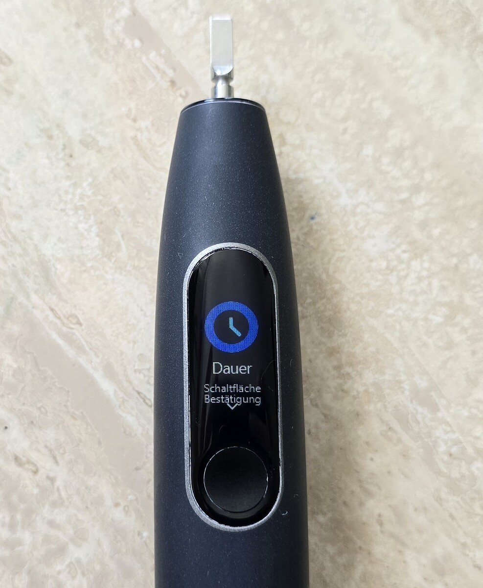 Wyświetlane treści są łatwo rozpoznawalne, ale panel mógłby być nieco jaśniejszy i większy. Niestety dostosowanie nie jest możliwe. Przynajmniej wyświetlany jest stan baterii szczoteczki, czego do tej pory brakowało flagowej szczoteczce Oclean.