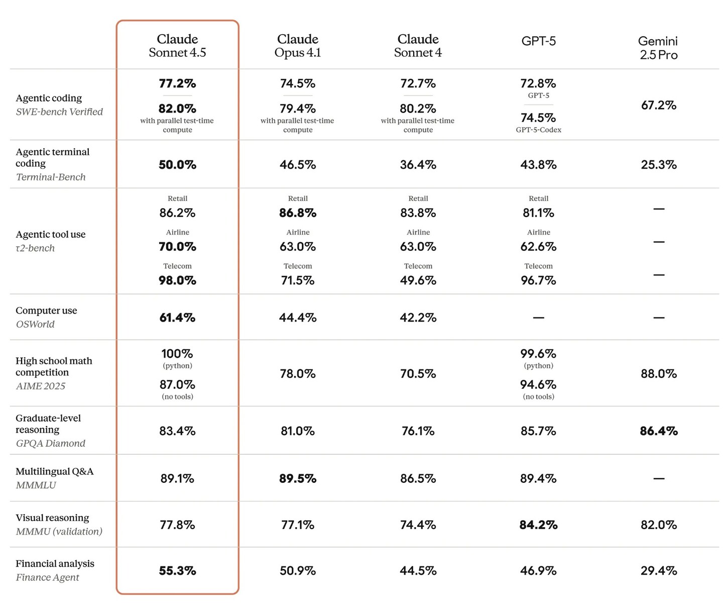 Sonnet 4.5 osiąga dobre wyniki w kilku głównych testach porównawczych kodowania AI, w tym SWE-bench i Terminal-Bench. Sztuczna inteligencja ma ulepszoną zdolność do korzystania z narzędzi komputerowych w celu autonomicznego wykonywania zadań, co widać w wiodącym benchmarku OSWorld umożliwiając jej stworzenie działającego klona strony internetowej claude.ai na własną rękę.