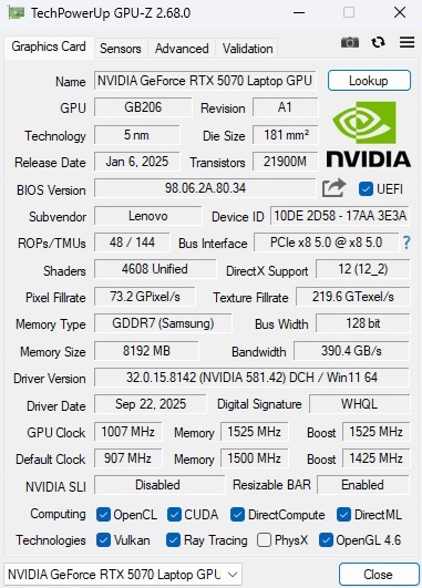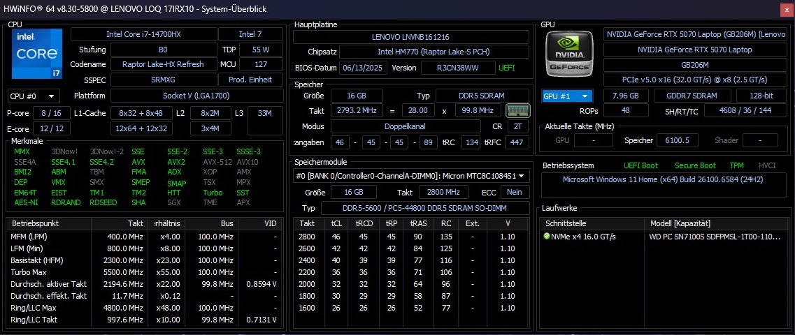 W związku z tym oczekiwania nie mogą być ustawione tak wysoko, jak w przypadku niektórych konkurentów, ale Lenovo - z jedną lub dwiema krytycznymi uwagami - wciąż udaje się wykonać przyzwoitą robotę. Na szczególne uznanie zasługuje dobra wydajność karty graficznej. Dzięki wbudowanemu podkręcaniu GPU, RTX 5070 zapewnia ponadprzeciętną wydajność. Po stronie pozytywów mamy również dwa gniazda pamięci RAM i SSD do przyszłych aktualizacji, stosunkowo dobre urządzenia wejściowe i powierzchnie odporne na zabrudzenia.