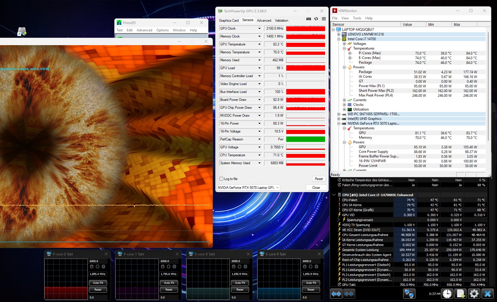 W teście obciążeniowym z wykorzystaniem narzędzi Furmark i Prime95, procesor rozgrzał się do około 74 °C, co jest wartością umiarkowaną, podczas gdy karta graficzna rozgrzała się do około 82 °C.