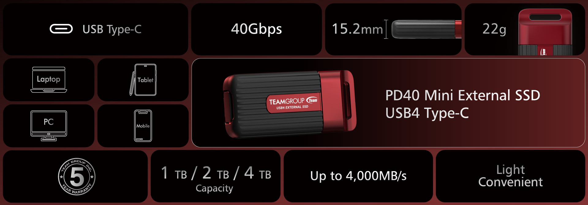 Team Group zaprezentował nowy przenośny dysk twardy - PD40 Mini External SSD. Jest on wyposażony w złącze USB4, ale jest również kompatybilny z urządzeniami USB 3.2 i USB 2.0. Niemniej jednak, dzięki szybszemu portowi typu C, firma twierdzi, że może zaoferować prędkość odczytu do 4000 MB/s.