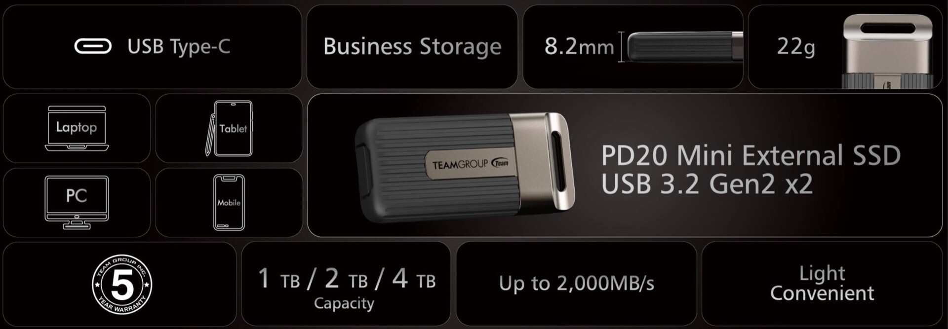 TeamGroup PD20 Mini SSD jest dostępny z 1 TB, 2 TB lub 4 TB pamięci masowej. TeamGroup nie potwierdził jeszcze cen i szczegółów dotyczących premiery. TeamGroup oferuje pięcioletnią gwarancję na dysk SSD. Szczegóły dotyczące funkcji można znaleźć na stronie produktu https://www.teamgroupinc.com/en/product-detail/ssd/TEAMGROUP/pd20/pd20-TPSEG5004T0C102/.