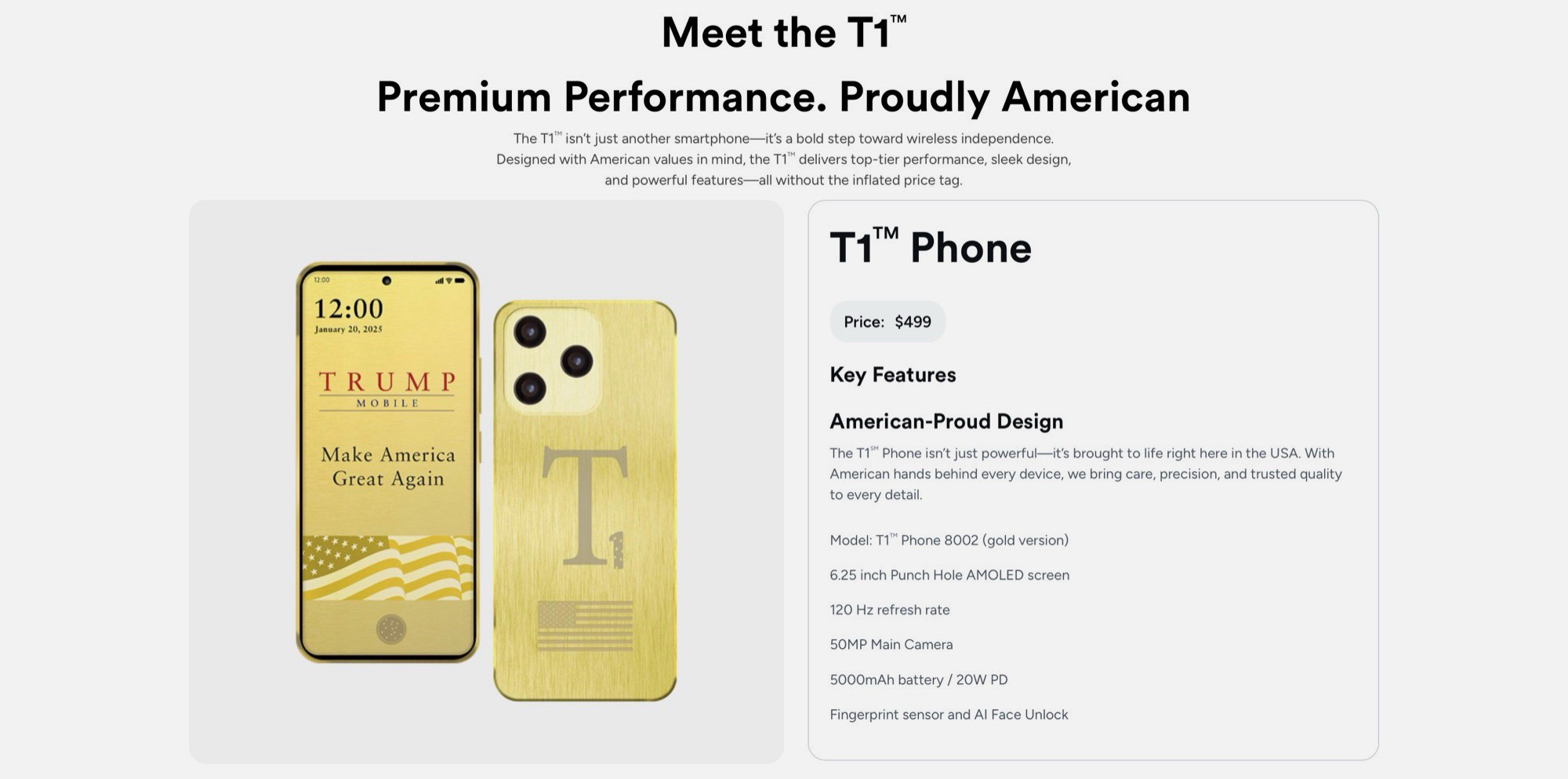 Telefon Trump T1 został zaprezentowany w połowie czerwca 2025 roku. Wyceniony na 499 USD smartfon średniej klasy oferuje specyfikacje bardziej zbliżone do znacznie tańszych urządzeń klasy podstawowej. Zamówienia przedpremierowe rozpoczęły się wkrótce po jego ogłoszeniu, wymagając od pierwszych nabywców wpłacenia depozytu w wysokości 100 USD. Zaledwie dwa tygodnie po debiucie Trump Mobile zdążył już zmienił swoje specyfikacje i potwierdził, że nie jest "Made in USA", jak pierwotnie reklamowano.