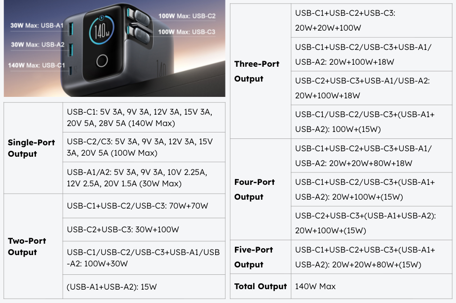 Jeśli chodzi o dostarczaną moc, powyższe wartości należy rozumieć jako maksymalną moc wyjściową, gdy podłączone jest tylko jedno urządzenie (maksymalna moc ładowarki 140 W). Jeśli na przykład dwa urządzenia są podłączone do portów C1 i C2 (Type-C), które mogą pochłaniać odpowiednio wysoką moc, wówczas dzielą się maksymalną dostępną mocą i dostarczają po 70 watów.