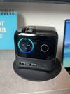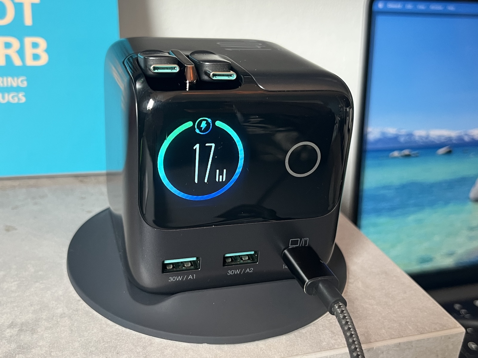 Ładowarka Joyroom Podix 140W pochodzi z projektu crowdfundingowego. Nie została zaprojektowana jako mobilny zasilacz, ale raczej jako uniwersalna stacja ładująca do domu i biura. Nasza waga wskazywała 464 gramy, czyli zdecydowanie za dużo, aby regularnie zabierać ją ze sobą. Stacjonarne zastosowanie jest podkreślone przez dołączoną gumową podstawkę, która ma samoprzylepną (i zmywalną) silikonową powłokę na spodzie. Sama ładowarka jest utrzymywana na miejscu magnetycznie. Zasadniczo można zrezygnować z podstawki, ale należy ją wtedy przytrzymać drugą ręką podczas korzystania z samoblokujących się kabli typu C. Więcej na ten temat później. Możliwe jest również przechylenie go na boczną powierzchnię; potrójne dotknięcie wyświetlacza dostosowuje jego orientację.