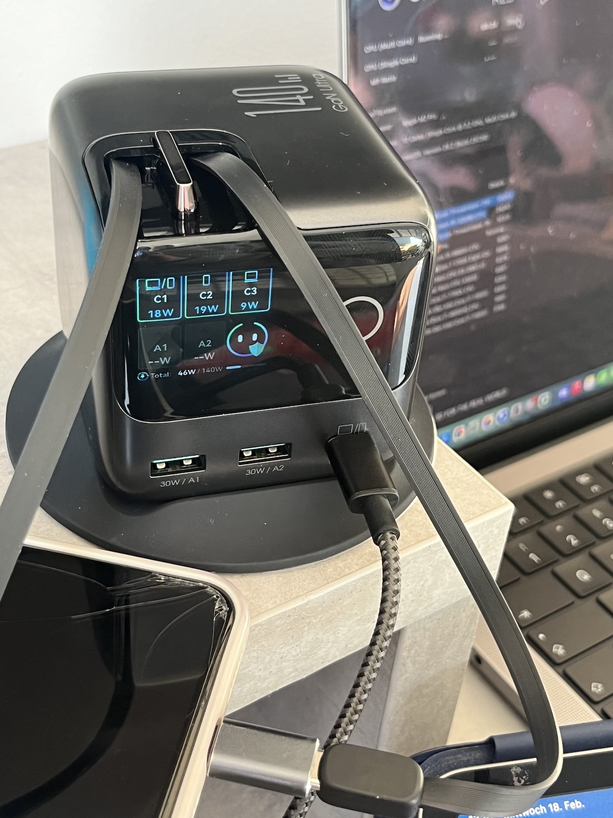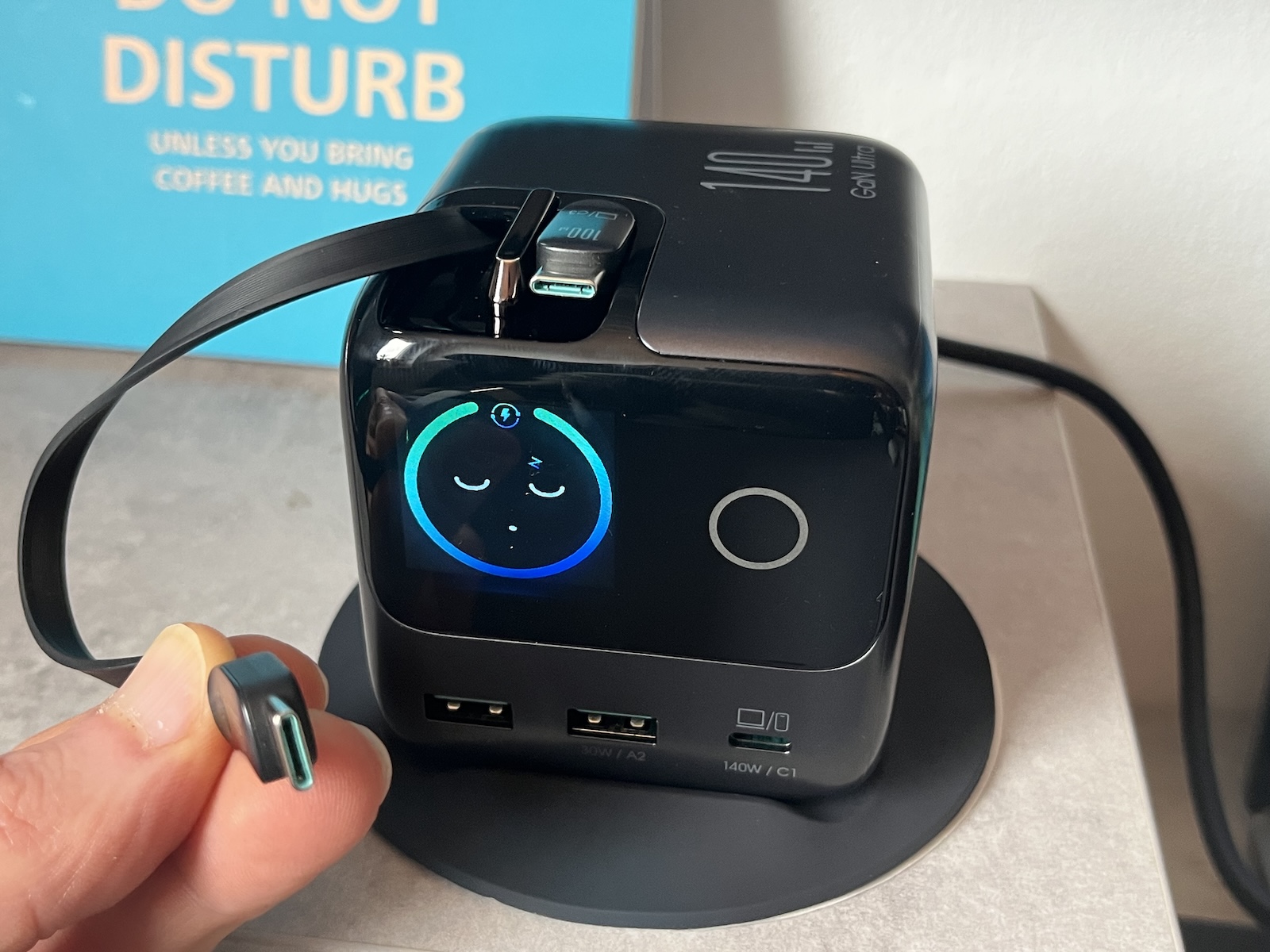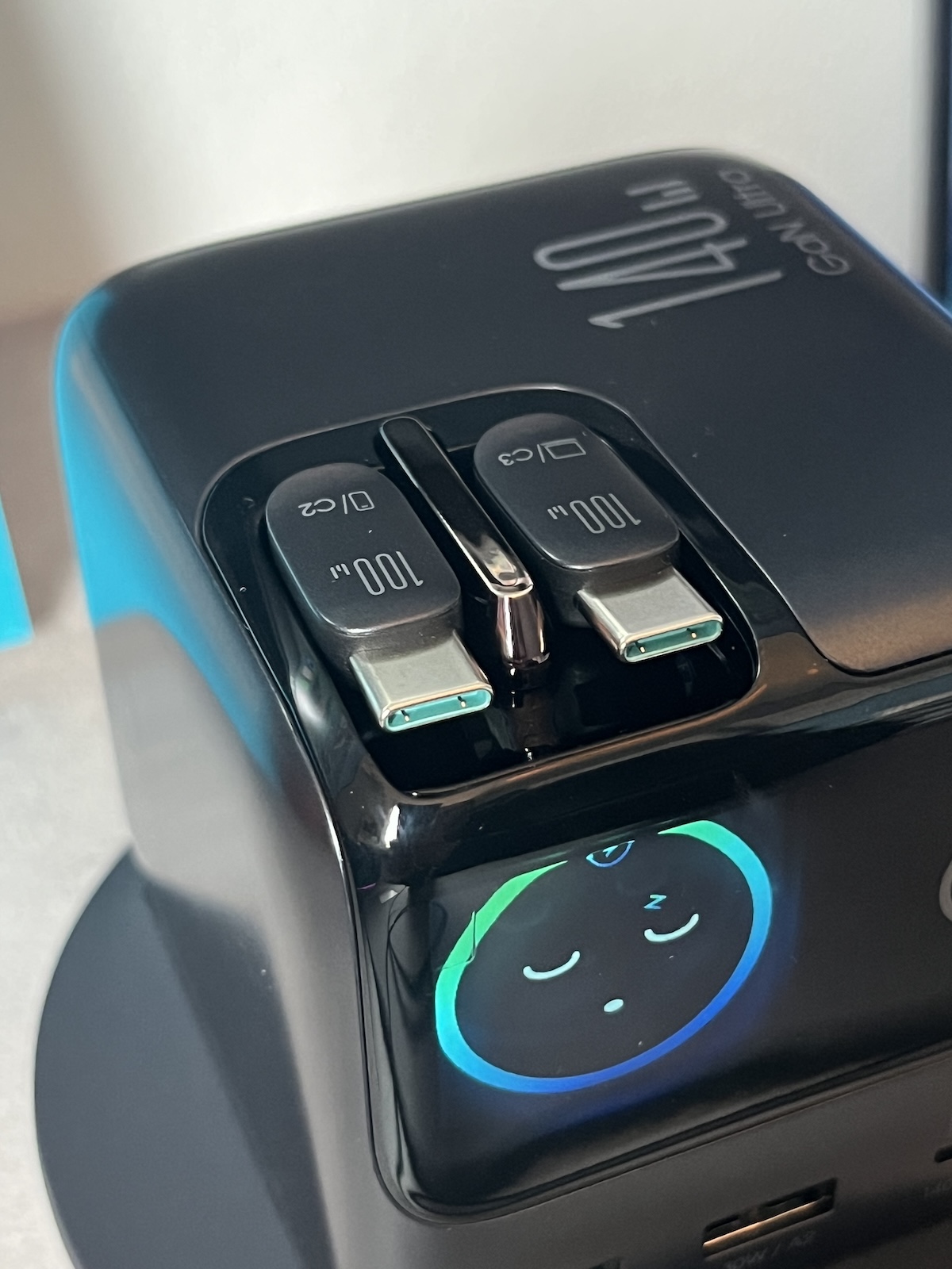 Ładowarka Joyroom Podix 140W oferuje wiele portów, dzięki czemu może zastąpić kilka oddzielnych ładowarek i kabli. Moc wyjściowa do 140 W z łatwością wystarczy do zasilania nawet laptopów (do użytku biurowego) i ładowania różnych małych gadżetów w tym samym czasie. Należy zachować ostrożność przy przydzielaniu portów, ponieważ moc wyjściowa poszczególnych portów jest poważnie ograniczona, gdy używanych jest wiele portów. Najważniejszym elementem są dwa kable typu C, które są zwinięte w urządzeniu i w razie potrzeby można je przedłużyć do około 75 centymetrów. Oznacza to, że leżące w pobliżu kable do ładowania telefonów komórkowych wreszcie należą do przeszłości.