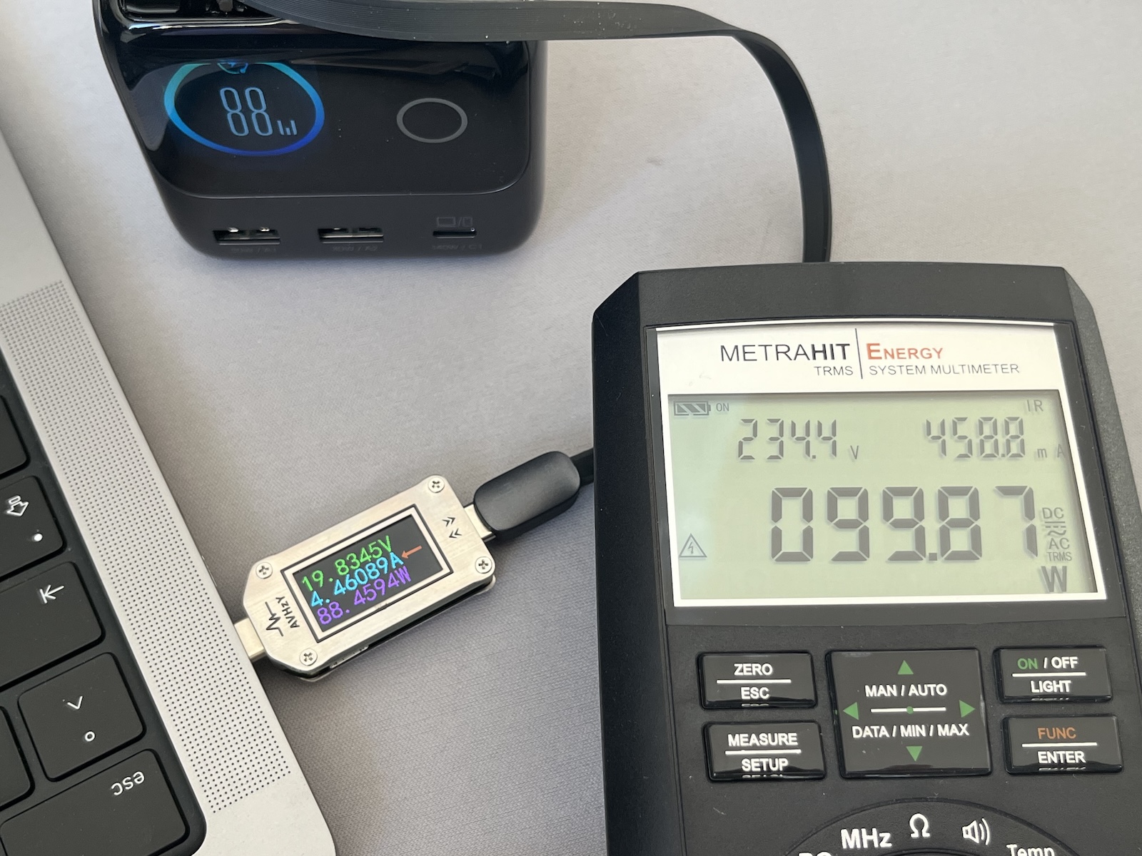 Przyjrzeliśmy się również bliżej wydajności i dokładności określonych wartości mocy. W tym celu wykorzystaliśmy wysokiej jakości multimetr Gossen Metrawatt oraz miernik mocy USB firmy AVHzY. Zgodnie z naszymi porównaniami, wartości mocy podłączonych odbiorników pokazane na wyświetlaczu są zgodne w zakresie 0-5% odchylenia.