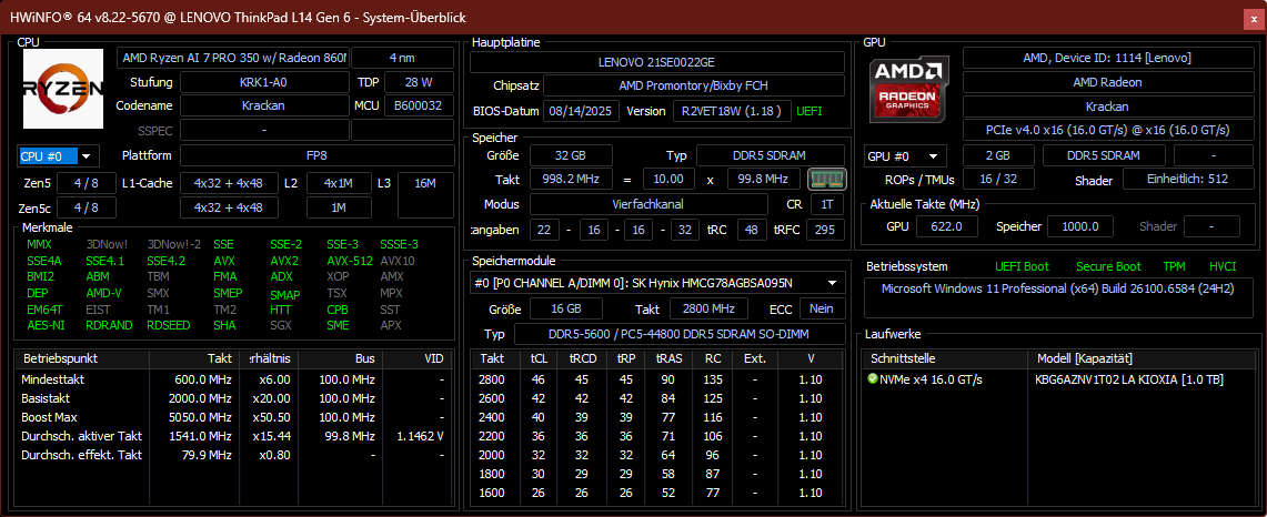| Lenovo ThinkPad L14 Gen 6 21SE0022GE Ryzen AI 7 PRO 350, Radeon 860M, Kioxia BG6 KBG6AZNV1T02, IPS LED, 1920x1200, 14" | Lenovo ThinkPad L14 G5 21L50014GE R5 7535U, Radeon 660M, Lenovo UMIS AM6A0 RPETJ512MKP1QDQ, IPS LED, 1920x1200, 14" | Asus ExpertBook PM3406 Ryzen AI 7 350, Radeon 860M, Western Digital PC SN5000S SDEQNSJ-512G-1002, IPS, 1920x1200, 14" | Dell Pro 14 Plus PB14255 GH77W Ryzen AI 7 PRO 350, Radeon 860M, Micron 2500 1TB MTFDKBA1T0QGN, IPS LED, 1920x1200, 14" | HP EliteBook 6 G1q 14 SD X Plus X1P-42-100, Adreno X1-45 1.7 TFLOPS, Samsung PM9A1 MZVL2512HCJQ, IPS, 1920x1200, 14" | Lenovo ThinkPad E14 Gen 7 21U2002QGE Core Ultra 5 228V, Arc 130V, Samsung PM9C1b MZVL81T0HFLB-00BH1, IPS, 2880x1800, 14" | Przeciętny AMD Radeon 860M | Średnia w klasie Office | |