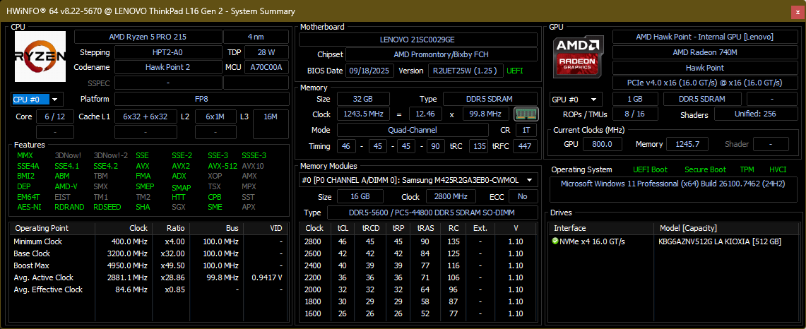 | Lenovo ThinkPad L16 Gen 2 21SC0029GE AMD Ryzen 5 PRO 215 ⎘ AMD Radeon 740M ⎘ 32 GB Pamięć, 512 GB SSD | Amazon: Cena katalogowa: 1090 Euro | 1.9 kg | 25 mm | 16.00" 1920x1200 142 PPI LED IPS | |