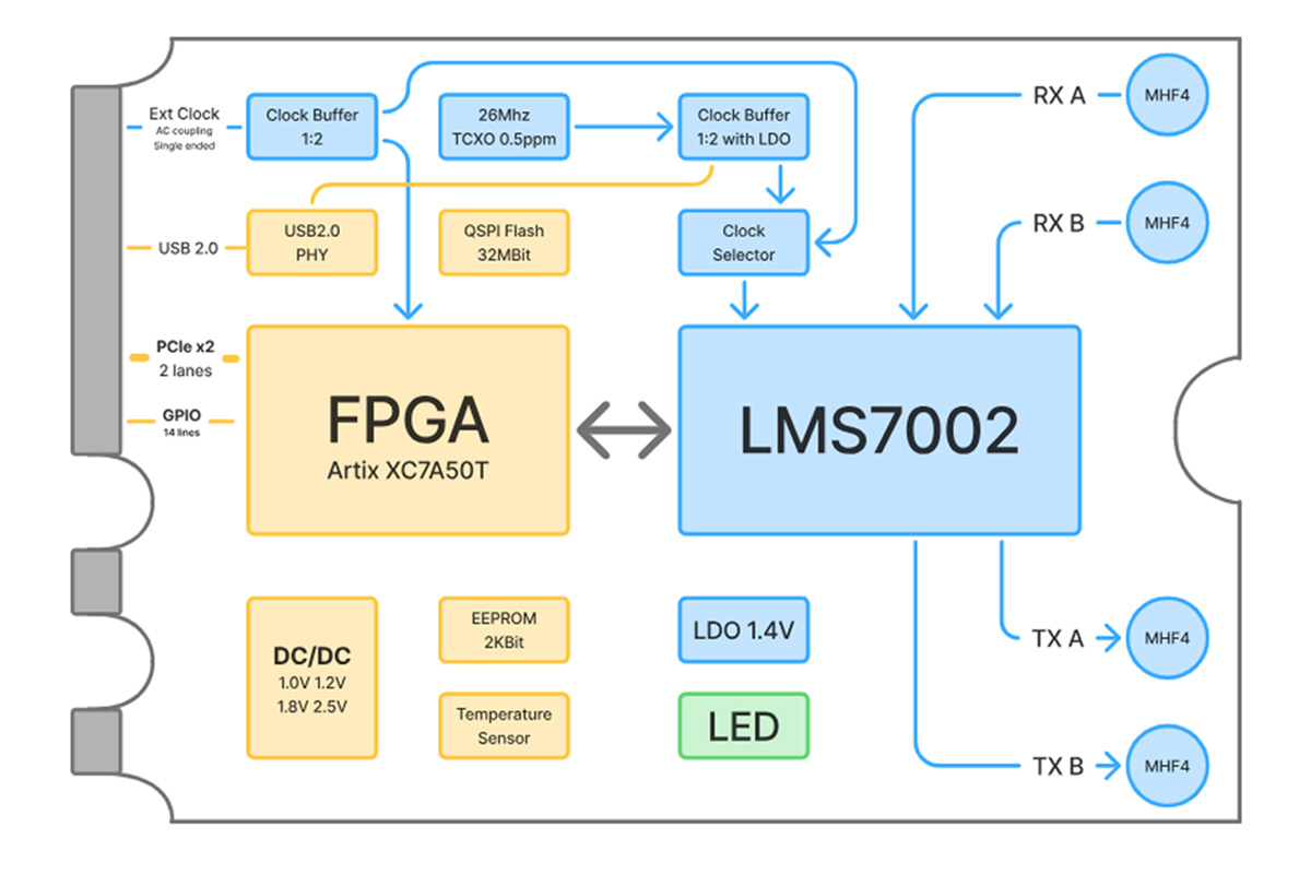 Podstawą xSDR jest nadajnik-odbiornik LMS7002M RF firmy Lime Microsystems w połączeniu z układem FPGA AMD Artix-7 XC7A50T. Ta kombinacja obejmuje zakres strojenia od 30 MHz do 3,8 GHz. Układ SDR obsługuje częstotliwości próbkowania od 0,1 MSPS do 122,88 MSPS w trybie SISO i ponad 80 MSPS w trybie MIMO, przy szerokości pasma kanału od 0,5 MHz do 90 MHz. Cztery złącza antenowe MHF4 zapewniają dostęp do dwóch kanałów RX i dwóch kanałów TX.