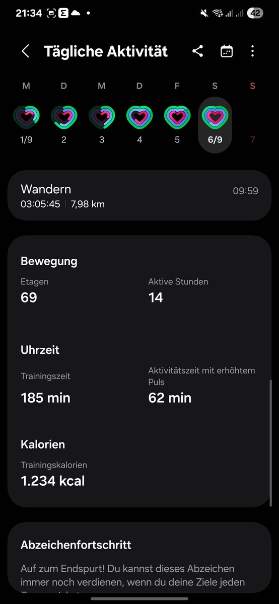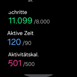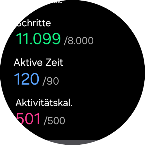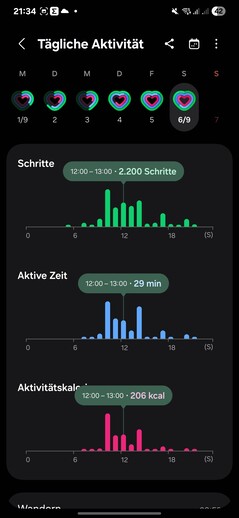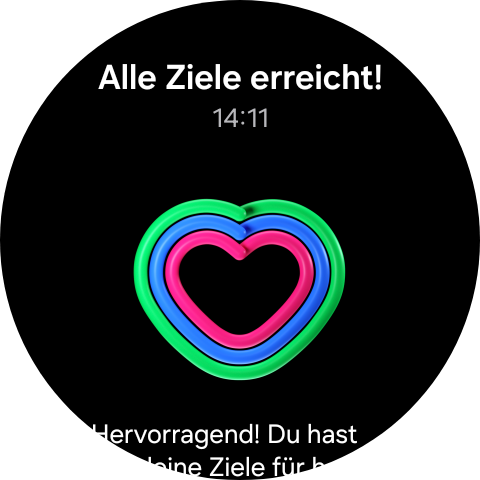 Aktywności są reprezentowane przez ikony serca, które wypełniają się w miarę osiągania celów. Podstawowe wskaźniki obejmują kroki, spalone kalorie i aktywne minuty, a także dystans, pokonane piętra i czas trwania treningu.
