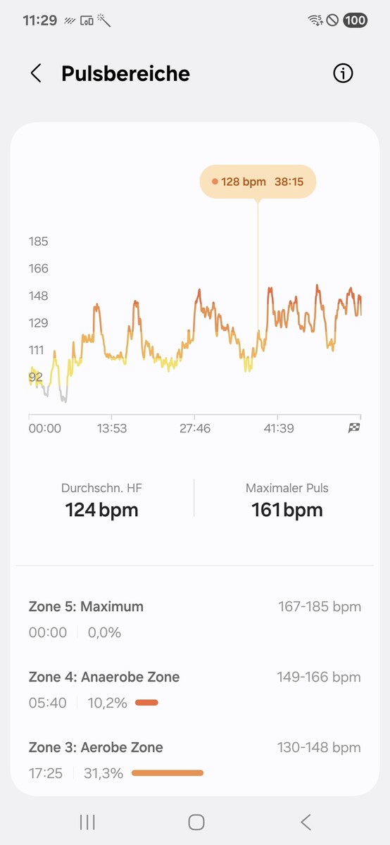 Do śledzenia tętna użyliśmy paska na klatkę piersiową Polar H10 jako urządzenia referencyjnego. Oba urządzenia zarejestrowały identyczne tętno spoczynkowe, ze średnim odchyleniem 2,37% w trzech pomiarach. Maksymalne odchylenie w pojedynczym teście wyniosło 7 uderzeń na minutę.