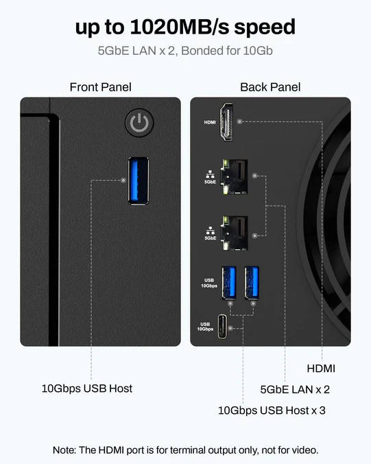 Pojedyncze wyjście HDMI umożliwia podłączenie zewnętrznego wyświetlacza. Oba urządzenia NAS obsługują Docker, umożliwiając użytkownikom uruchamianie szerokiej gamy aplikacji. Oferują one również kompleksowe opcje bezpieczeństwa i integrację z usługami w chmurze. Ta ostatnia funkcja daje użytkownikom możliwość tworzenia kopii zapasowych danych w chmurze oprócz urządzeń lokalnych w celu zapewnienia dodatkowej ochrony.