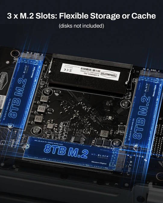 Kolejną kluczową różnicą między modelami jest pamięć. Mierzący 150 x 181 x 219 mm (5,91 x 7,13 x 8,62 cala), czterodyskowy F4-425 Plus oferuje dwa razy więcej pamięci niż jego dwudyskowy odpowiednik. Oba modele wyposażono jednak w dwa szybkie porty Ethernet 5 Gb/s, które umożliwiają imponujący transfer danych do 1 020 MB/s. Każdy dysk SSD łączy się za pośrednictwem jednego złącza PCIe 3.0, co pozwala w pełni wykorzystać potencjał nowszych, szybkich dysków.