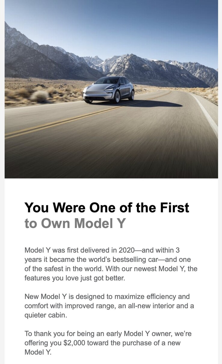 Mówi się, że obniżka ceny Modelu Y jest przeznaczona dla właścicieli, którzy wcześnie kupili inauguracyjnego SUV-a, ale dokładna data zakończenia produkcji nie jest jasna, więc ci, którzy chcą skorzystać, będą musieli poczekać na oficjalną wiadomość od Tesli, którą można zobaczyć poniżej.