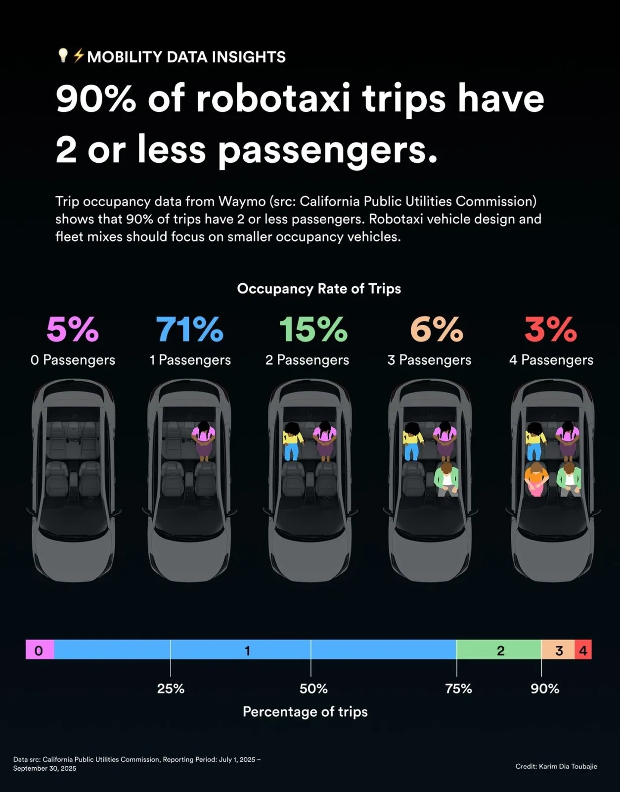 Dwumiejscowa koncepcja została teraz potwierdzona przez najnowsze statystyki dotyczące obłożenia Waymo. Okazuje się, że 90% przejazdów robotaxi bez kierowcy odbywa się z jedną lub dwiema osobami. Zdecydowana większość z nich jeździ również z jedną osobą, a tylko 9% obejmuje co najmniej jedną osobę na przednich siedzeniach.