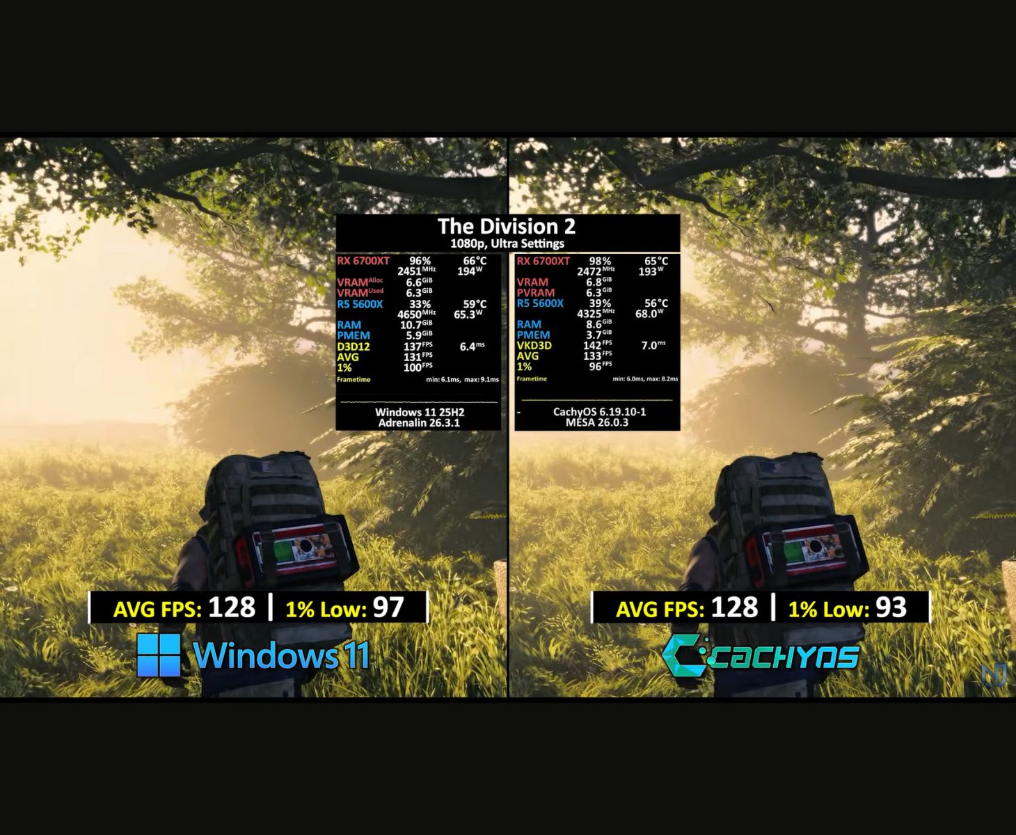 Jednakże, Windows 11 zniwelował lukę w grach takich jak The First Descendant przy ustawieniach 1080p Ultra z FSR 3 Native, gdzie uruchomił grę przy 63 FPS, podczas gdy CachyOS poradził sobie tylko z 54 FPS. Podczas uruchamiania The Division 2 w rozdzielczości 1080p Ultra, zarówno Windows 11, jak i CachyOS osiągnęły 128 FPS, przy czym Windows 11 zapewnił lepszy 1% niskich poziomów przy 97 FPS w porównaniu do 93 FPS na CachyOS.