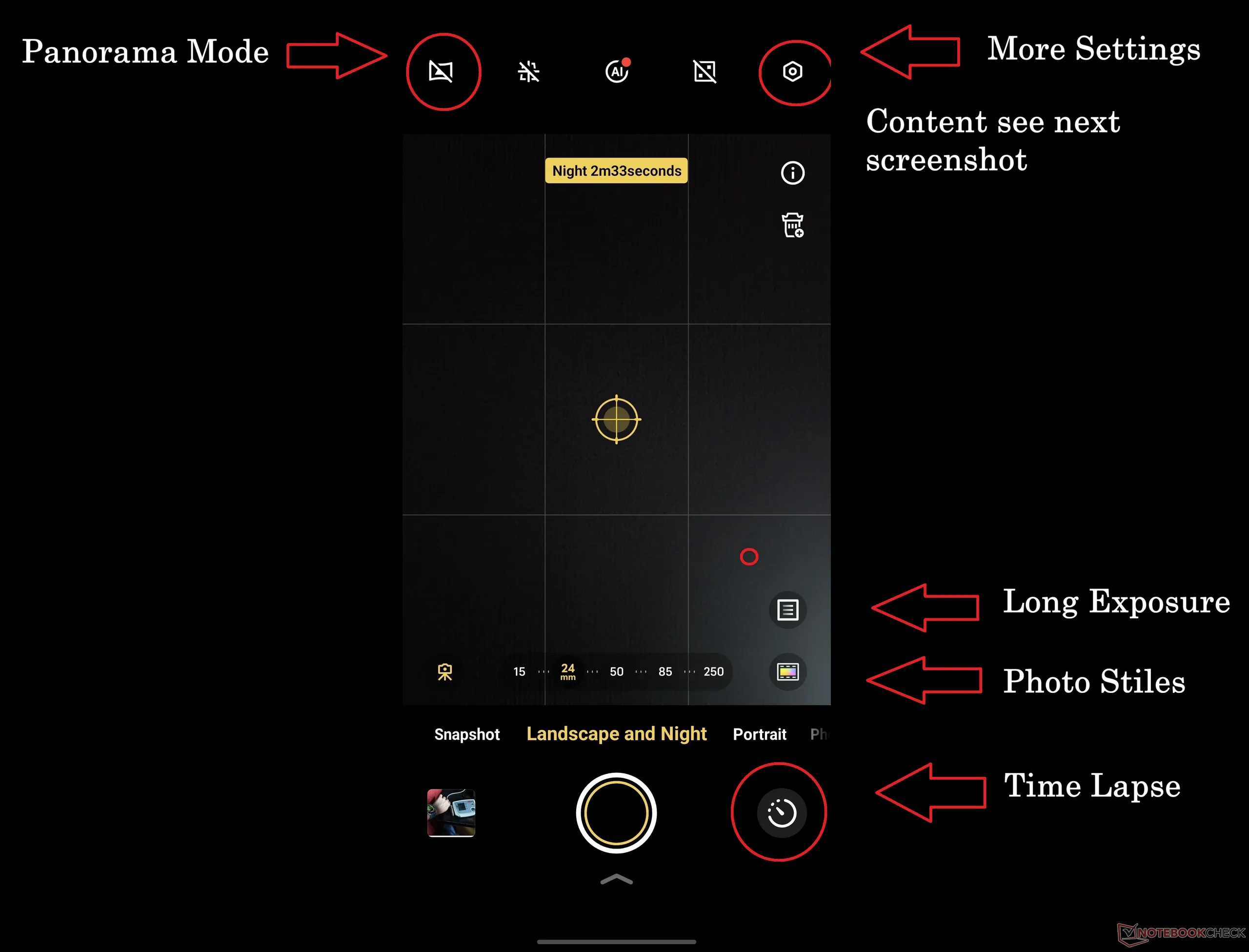 Niestety, aplikacja aparatu staje się coraz bardziej zagmatwana. Czuję, że brakuje tu spójności. Tryb Krajobrazu i Nocy dla wszelkiego rodzaju trybów specjalnych, takich jak Długa ekspozycja, Timelapse, Super-Moon lub Astro-fotografia, jest w zasadzie dobrym pomysłem, ale obecnie w tym trybie panuje chaos.