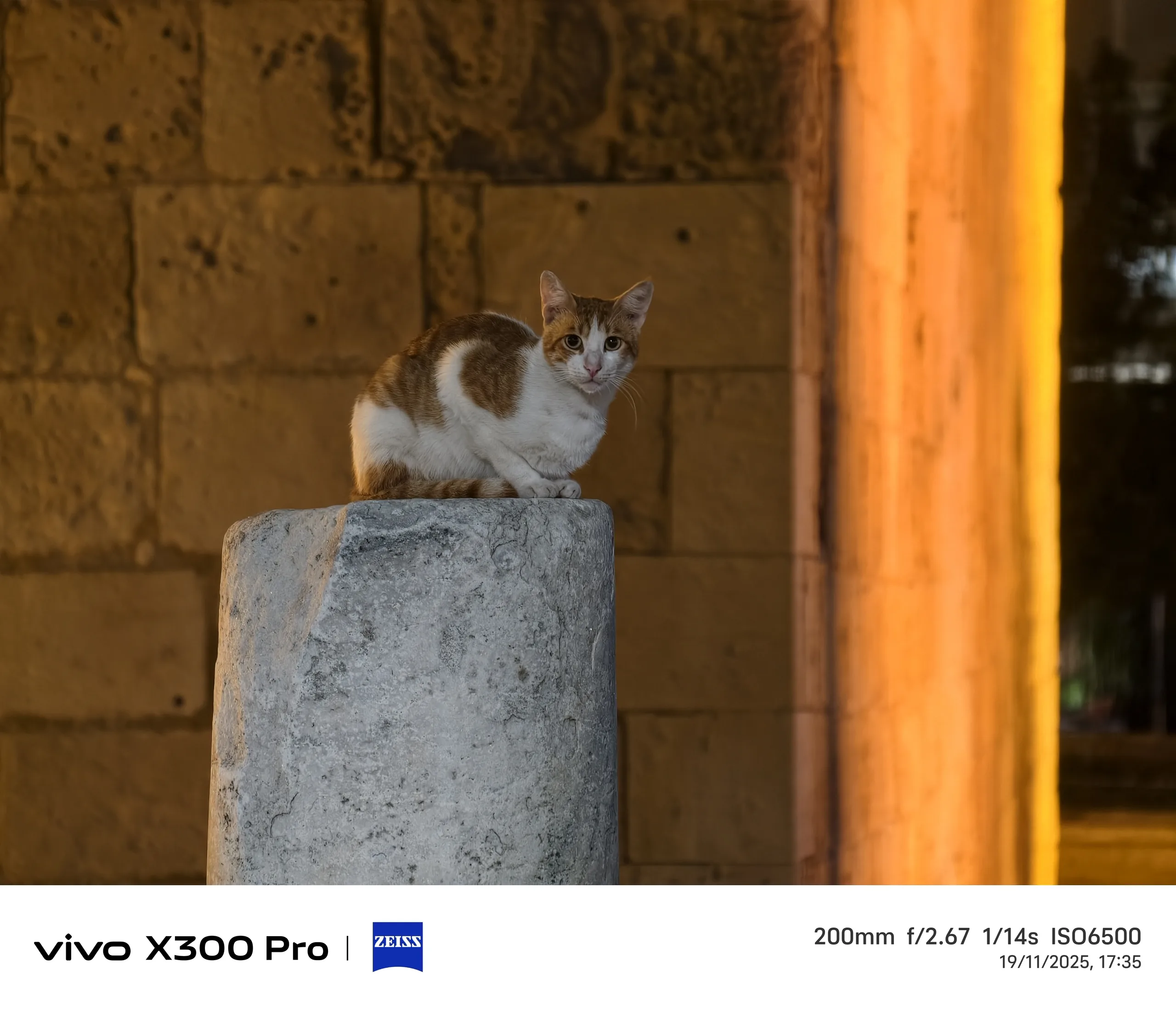 Zaskakująco lepsze doświadczenia miałem z telekonwerterem Vivo X300 Pro nawet w ciemniejszych sytuacjach, prawdopodobnie dlatego, że byłem w stanie ustabilizować obiektyw na balustradzie zamku Lemesos w Limassol, aby sfotografować kota, który rozgościł się na starożytnej kolumnie, ale niestety nie pozostał w jednej pozycji.