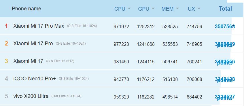 Podkreśla to najnowszy wykres wydajności AnTuTu. Xiaomi 17 jest wymieniony z wynikiem procesora 981,459 na oficjalnym wykresie. Imponujący wynik, ale tylko około 3% wyższy niż w przypadku Vivo X200 Ultra (959,329), mimo że ten telefon jest zasilany przez zeszłoroczny Snapdragon 8 Elite. Zarówno Xiaomi 17 Pro, jak i Xiaomi 17 Pro Max osiągają jeszcze niższe wyniki niż waniliowy Xiaomi 17.