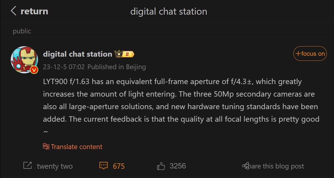 Ponadto Digital Chat Station twierdzi, że Xiaomi 14 Ultra będzie miał podwójny teleobiektyw wspierany przez nową architekturę. Przed tym raportem informator podzielił się informacją, że telefon będzie wyposażony w Sony LYT900 jako główny czujnik. Ponadto, Digital Chat Station twierdziło, że telefon będzie mógł pochwalić się trzema aparatami 50 MP obok LYT900.