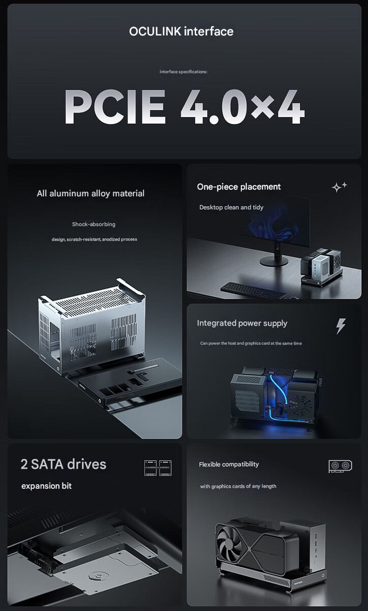 Topfeel wprowadził w Chinach dwie nowe stacje dokujące eGPU, G1 i G1 Pro. Spośród tych dwóch, G1 ma otwartą konstrukcję, dzięki czemu jest kompatybilny z prawie wszystkimi stacjonarnymi procesorami graficznymi. Otwarta natura stacji dokującej pozwala również pomieścić zasilacz ATX, ale firma zaleca zasilacz SFX, aby uzyskać bardziej elegancki wygląd.