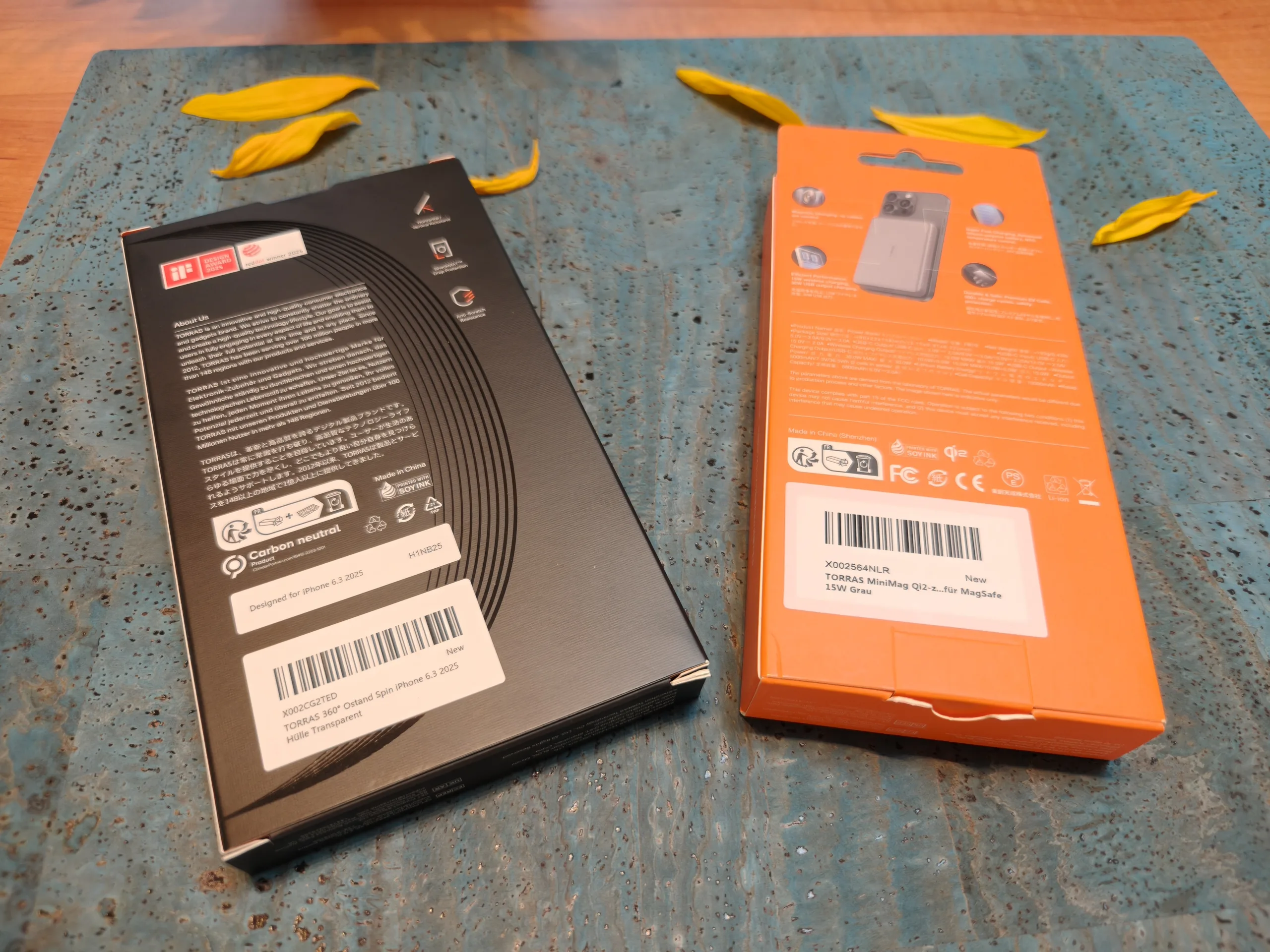 Etui na telefony i power banki od Torras są dostarczane w bardzo smukłych opakowaniach z nadrukiem z przyjaznego dla środowiska tuszu sojowego. Niestety, wewnątrz nadal używane są plastikowe tacki i folie.