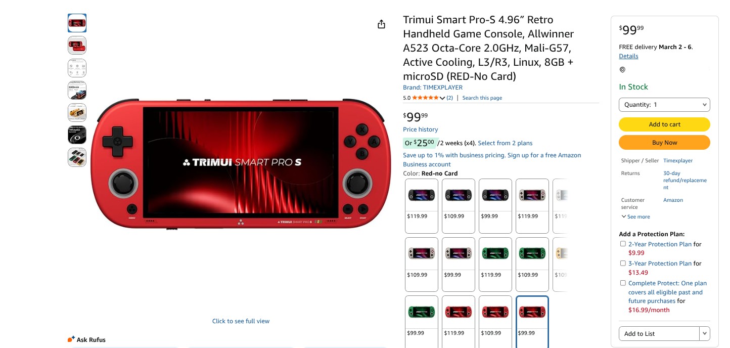W przeciwieństwie do Ayaneo Pocket Air Mini który jest sprzedawany przez oficjalny sklep Ayaneo i wysyłany z Amazon, TrimUI Smart Pro S jest sprzedawany i wysyłany przez zewnętrznego sprzedawcę o nazwie Timexplayer. Na szczęście, w przypadku jakichkolwiek problemów, kupujący mają prawo do 30-dniowego zwrotu pieniędzy lub wymiany urządzenia.
