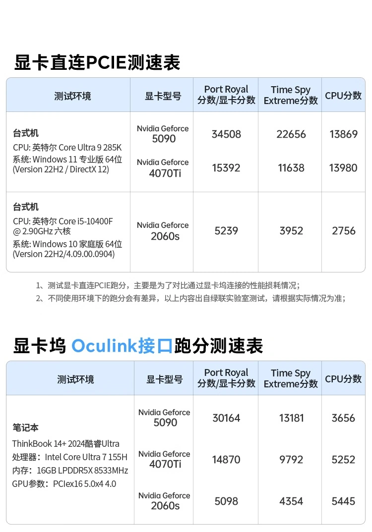 UGREEN udostępniła dane z testów porównawczych, aby zademonstrować, jak stacja dokująca wypada w porównaniu z tradycyjną konfiguracją komputera stacjonarnego. Karta graficzna RTX 5090 uzyskała 34 508 punktów w teście Port Royal na komputerze stacjonarnym, podczas gdy ta sama karta podłączona do laptopa za pośrednictwem portu Oculink LinkStation uzyskała 30 164 punktów. Wynik ten wskazuje, że podczas gdy bezpośrednie połączenie z płytą główną jest nadal szybsze, połączenie Oculink jest nadal w stanie utrzymać wysoki poziom wydajności dla konfiguracji zewnętrznych.