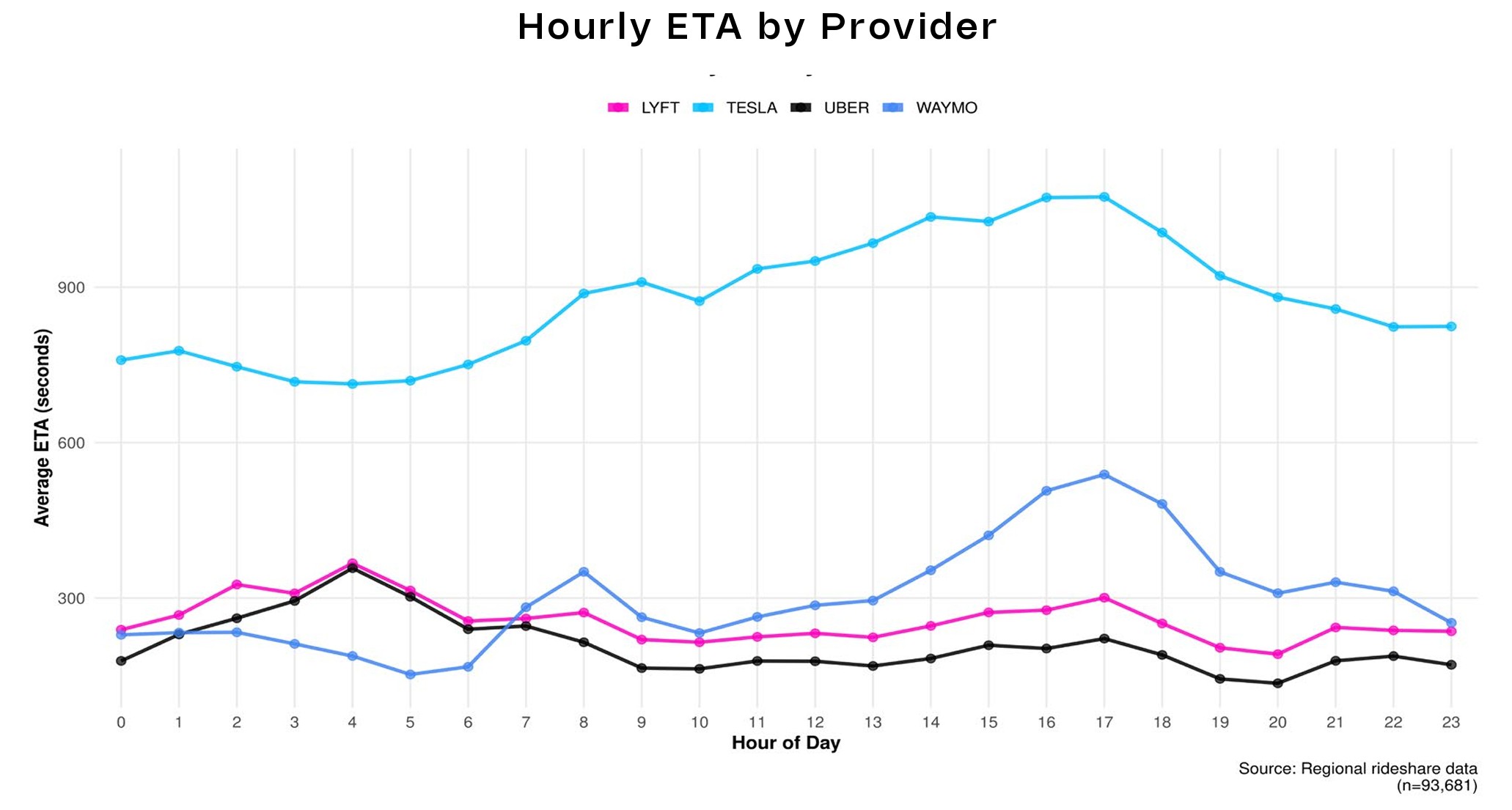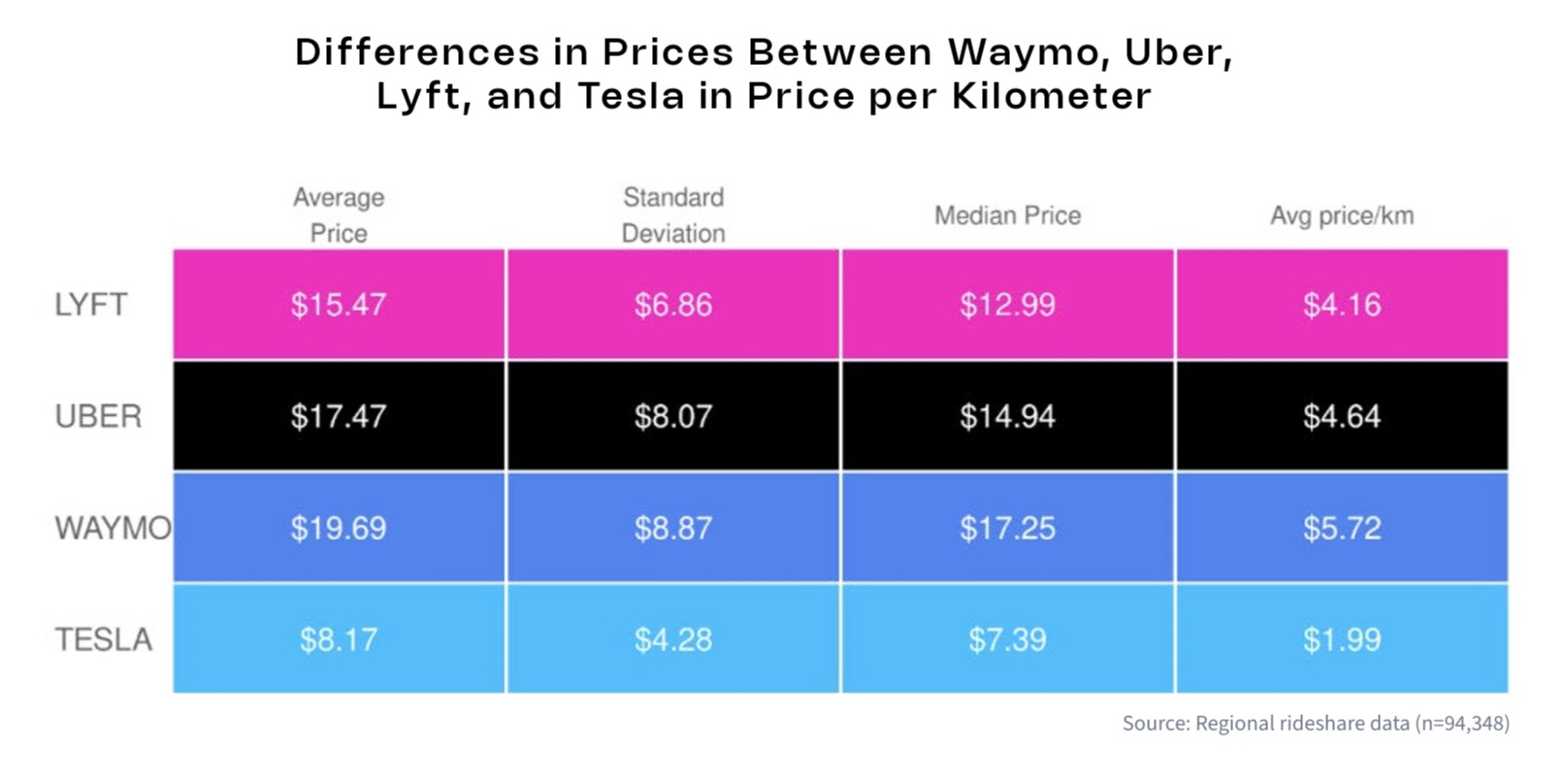 Według badania średnich cen przejazdów, Tesla pobiera tylko 1,99 USD za kilometr (3,20 USD za milę), podczas gdy średnia stawka Waymo jest prawie trzykrotnie wyższa. Wynika to ze średniej z 94 348 przejazdów, gdzie dane obejmują zarówno cenę przejazdu, jak i czas oczekiwania na daną usługę współdzielenia przejazdów.