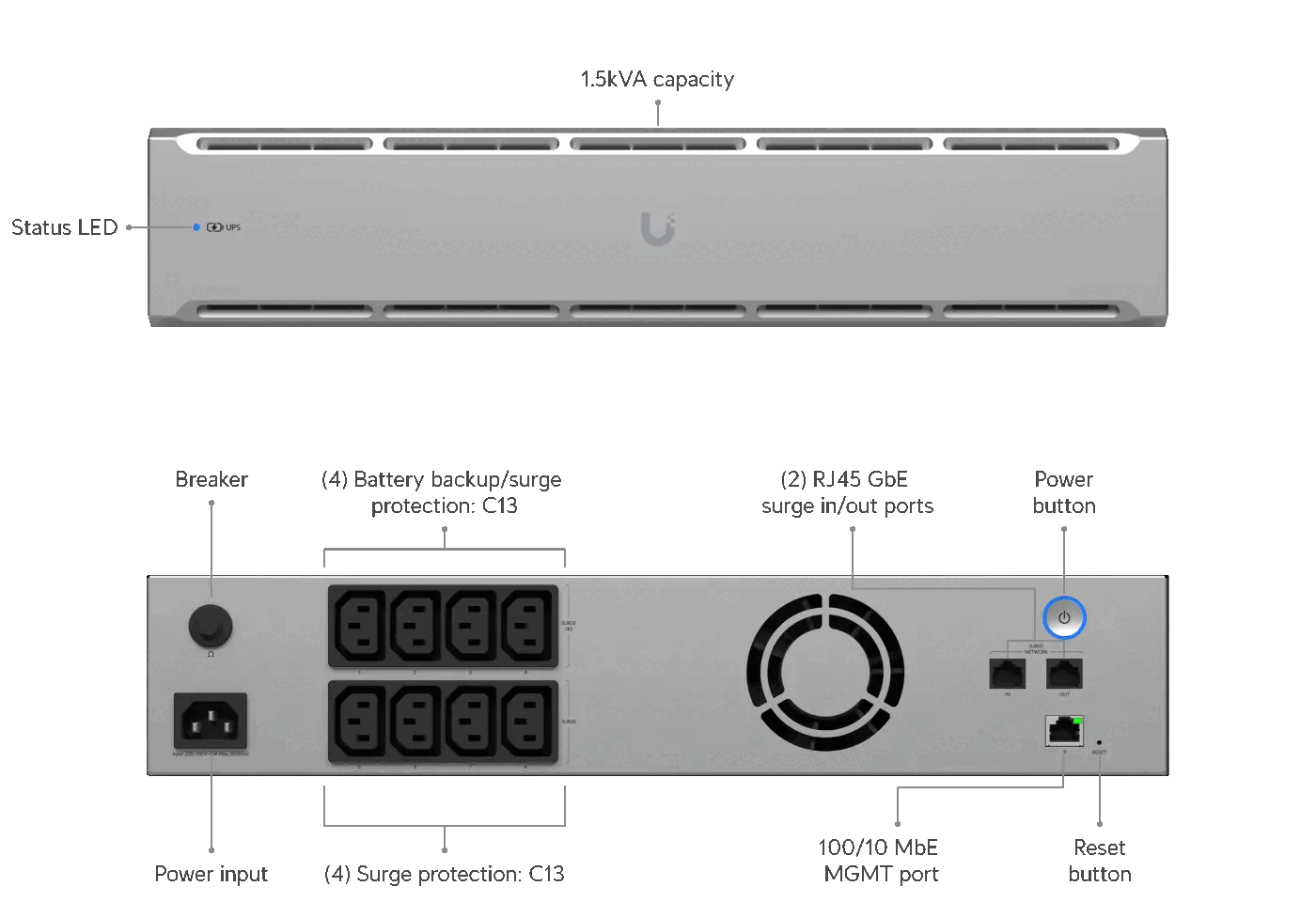 Unifi UPS Tower został zaprojektowany do montażu na komputerach stacjonarnych. Oprócz portu sieciowego do integracji Unifi i ochrony przeciwprzepięciowej dla połączeń sieciowych przez GbE, wieża oferuje łącznie dziesięć portów C13 dla wtyczek C14. Wszystkie porty są chronione przed przepięciami, a pięć z nich jest dodatkowo wspieranych przez wewnętrzną baterię w celu zapewnienia ciągłego zasilania.