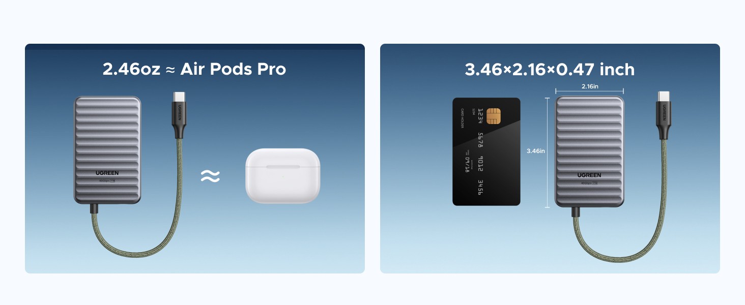 NeoDrive Go mierzy 3,46 x 2,16 x 0,47 cala i waży 2,46 uncji, czyli mniej więcej tyle samo co AirPods Pro. Pomimo lekkiego profilu, nadal zapewnia solidną trwałość z ochroną przed upadkiem z wysokości do 7 stóp, dzięki wytrzymałej obudowie z powłoką ekscymerową. Posiada również wbudowany 5,4-calowy kabel USB4 w oplocie, który służy również jako smycz do łatwego przenoszenia.