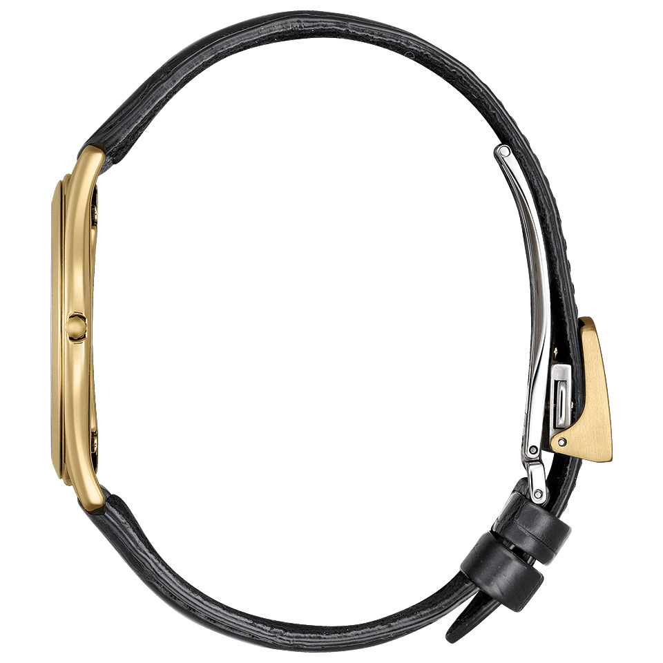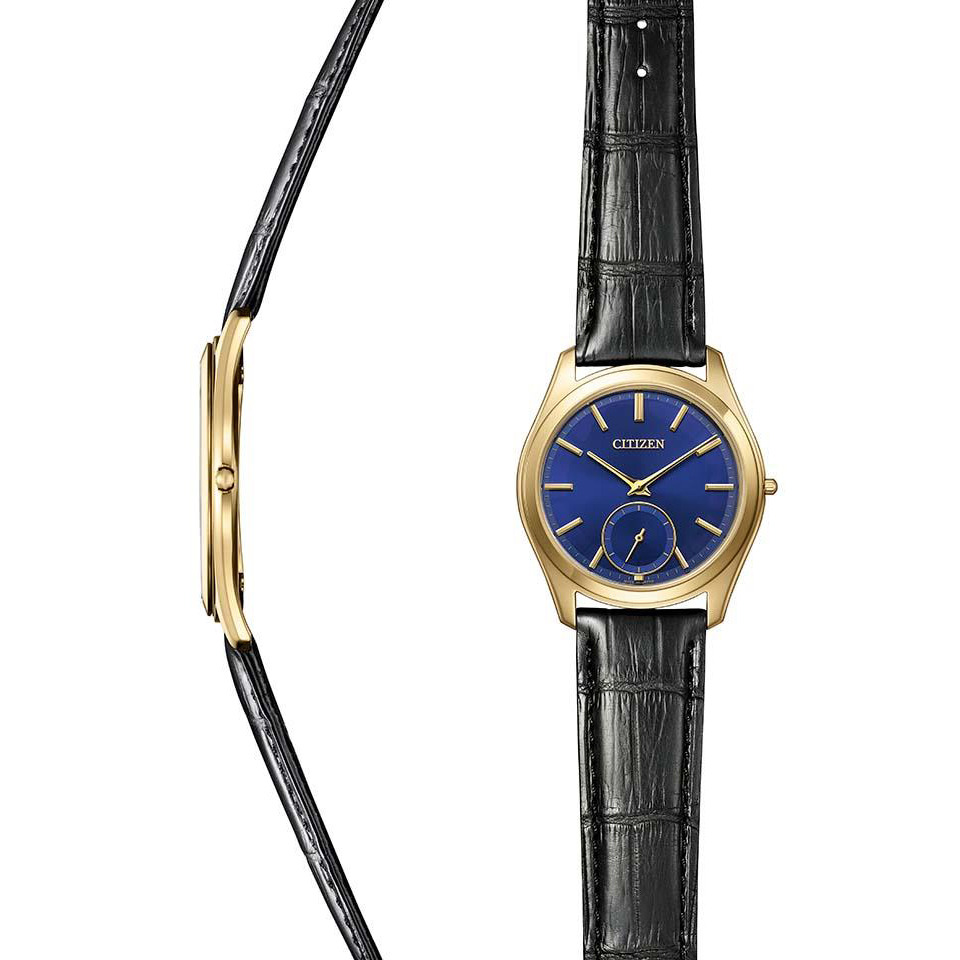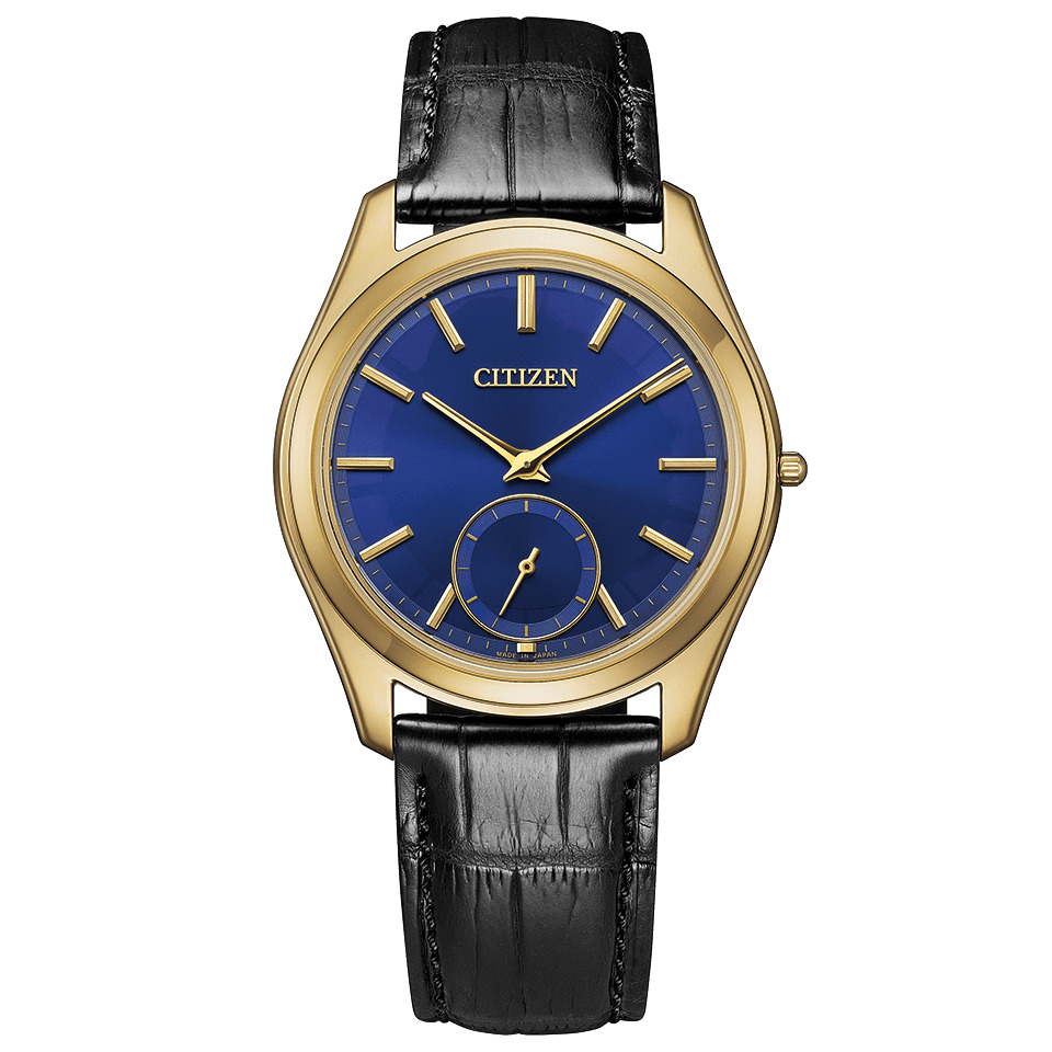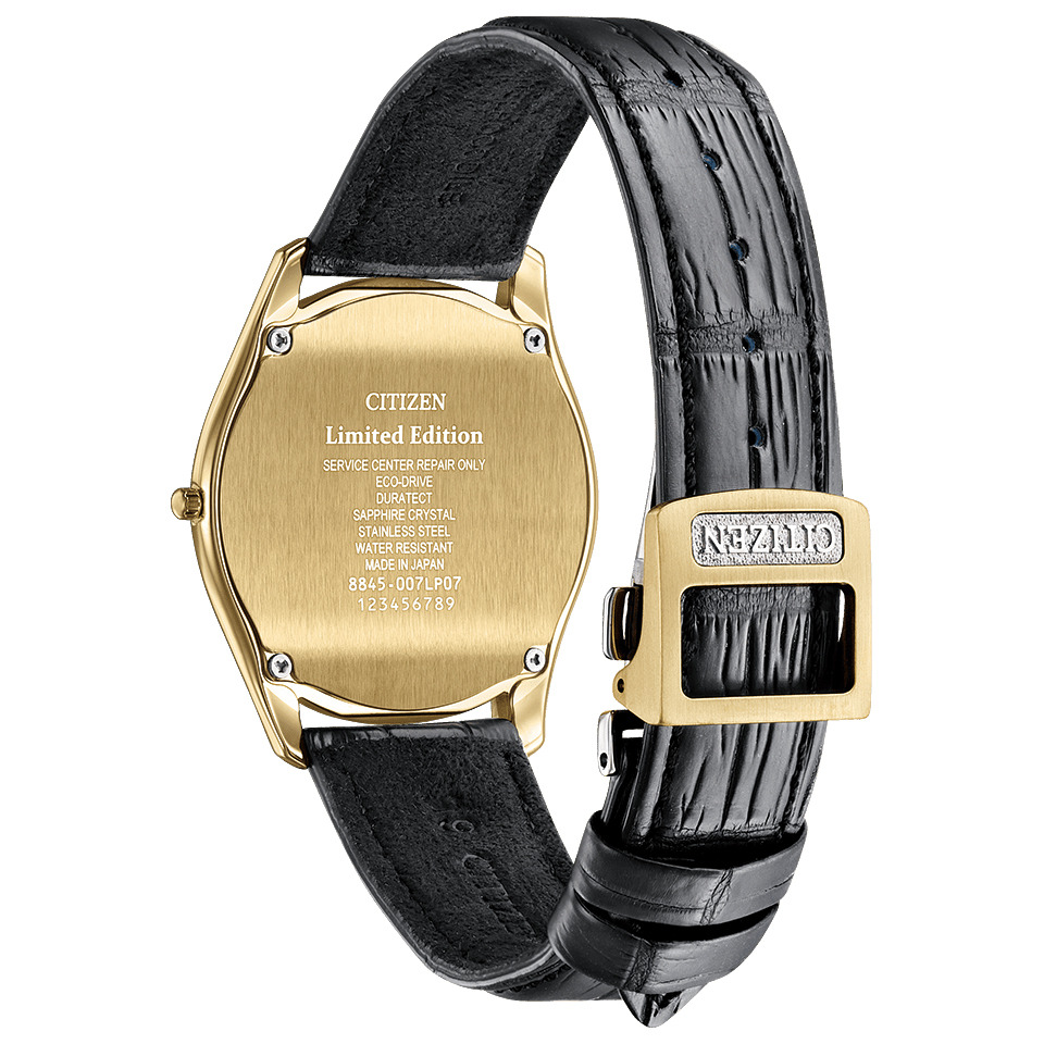 Drugim ujawnionym zegarkiem jest Citizen Eco-Drive One AQS0202-02L. Model ten obrał znacznie bardziej minimalistyczny kierunek. Wykończony jest bursztynowym złotem na stali nierdzewnej z ciemnoniebieską tarczą i nakładanymi indeksami pałeczkowymi. Jego koperta ma 36,6 mm i zaledwie 4,5 mm grubości, co czyni go jednym z najcieńszych modeli solarnych Citizen. Zasilanie pochodzi z kalibru 8845 Eco-Drive, który wykorzystuje światło do ładowania i eliminuje potrzebę wymiany baterii. Zamiast bransolety, zegarek dostarczany jest z czarnym skórzanym paskiem i pasującą złotą klamrą. Wersja ta jest limitowana do 250 sztuk i posiada wygrawerowany numer edycji na deklu.